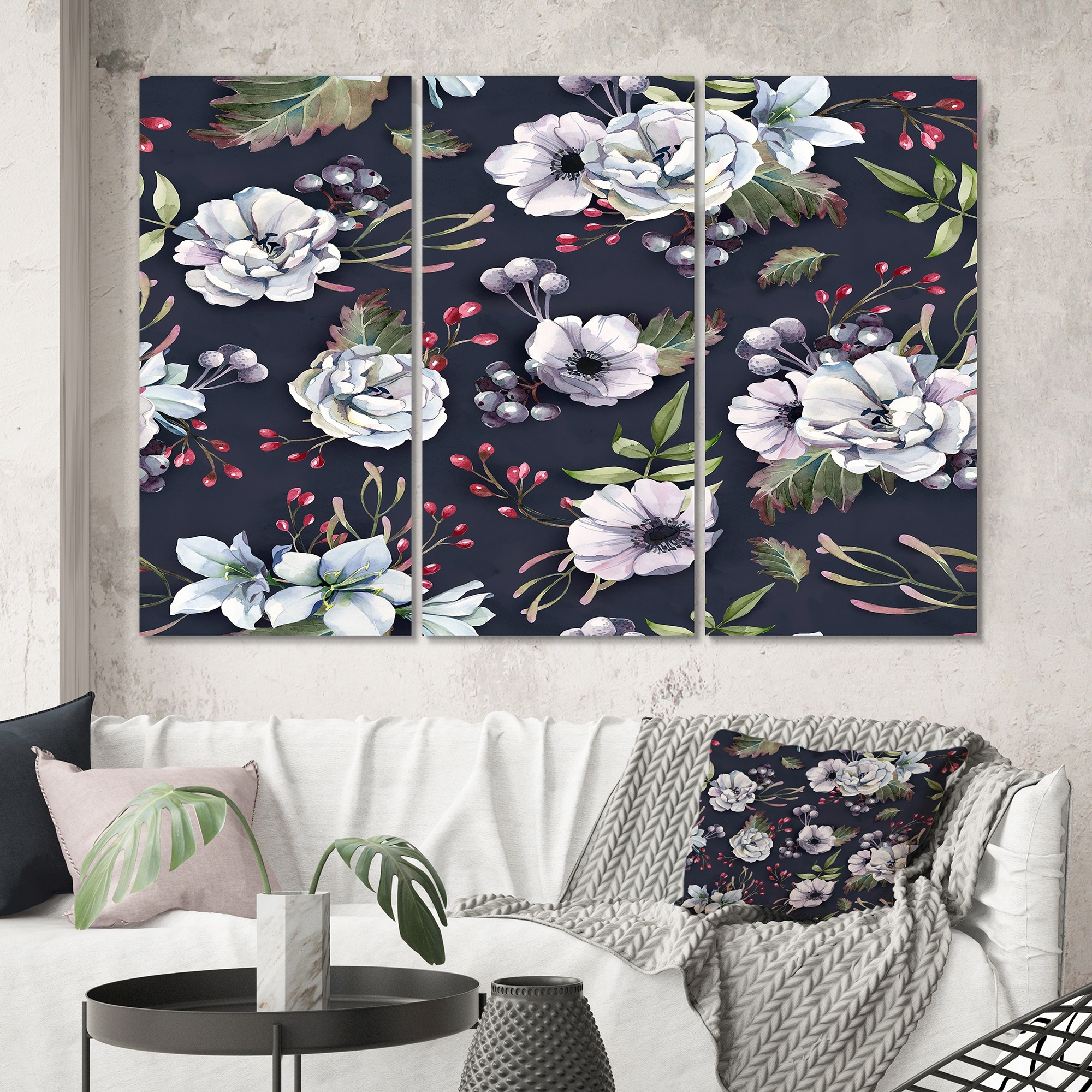 Designart "White Flowers And Red Berries" Patterned Canvas Wall Art Print