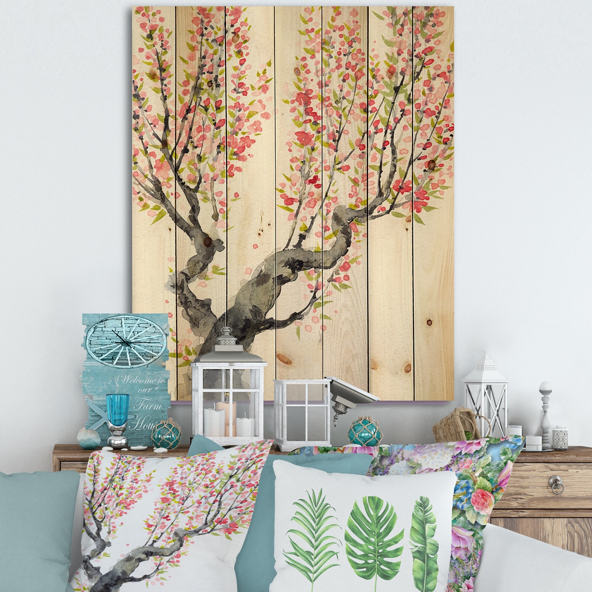 Designart 'Spring Red Flowers on Tree Branches' Traditional Print on Natural Pine Wood
