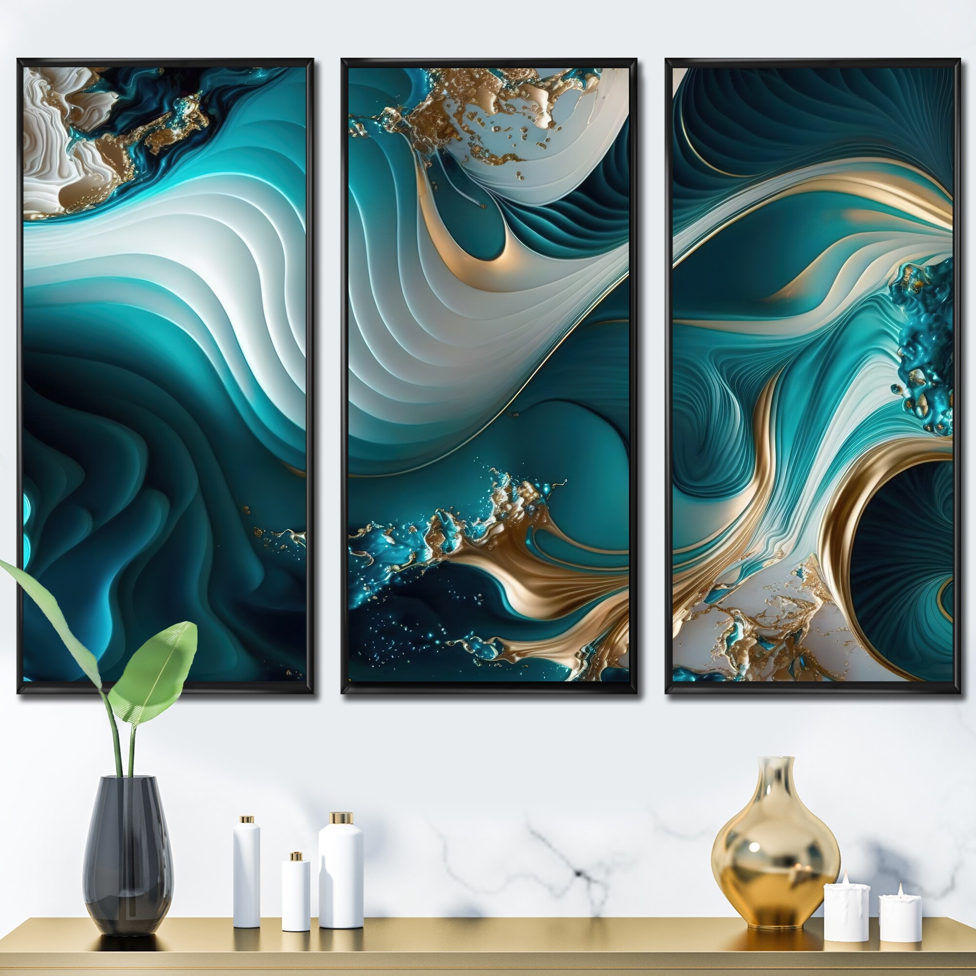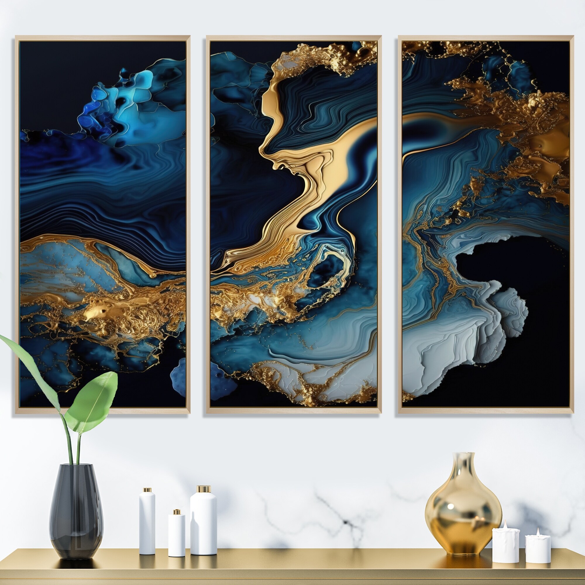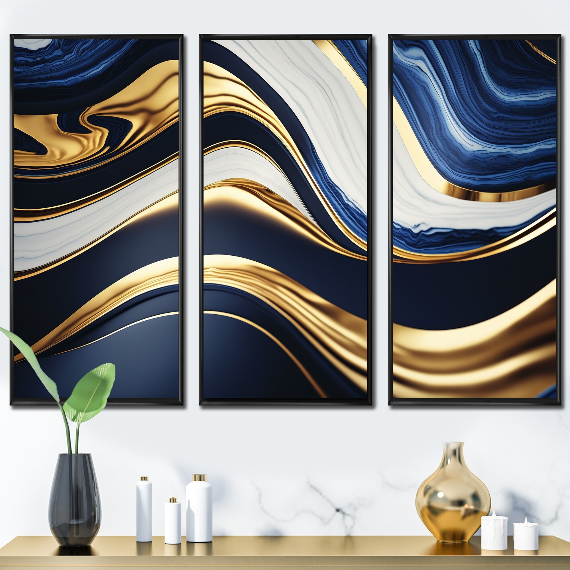 Designart "Abstract Geode Waves Blue And Gold V" Modern Waves Framed Canvas Art Print - 3 Panels