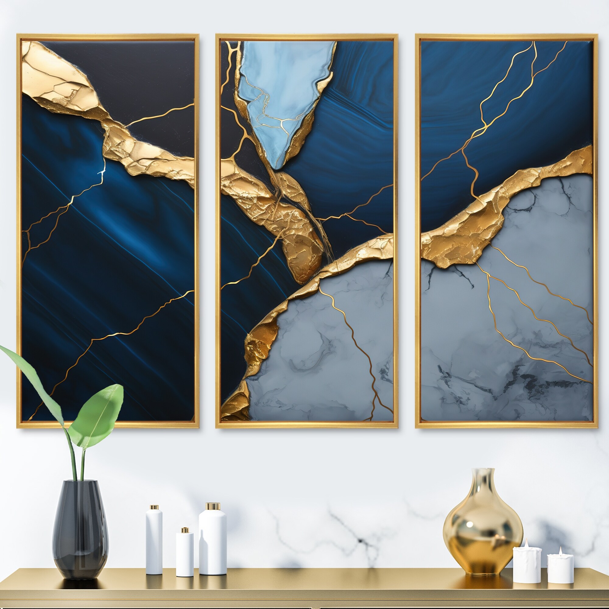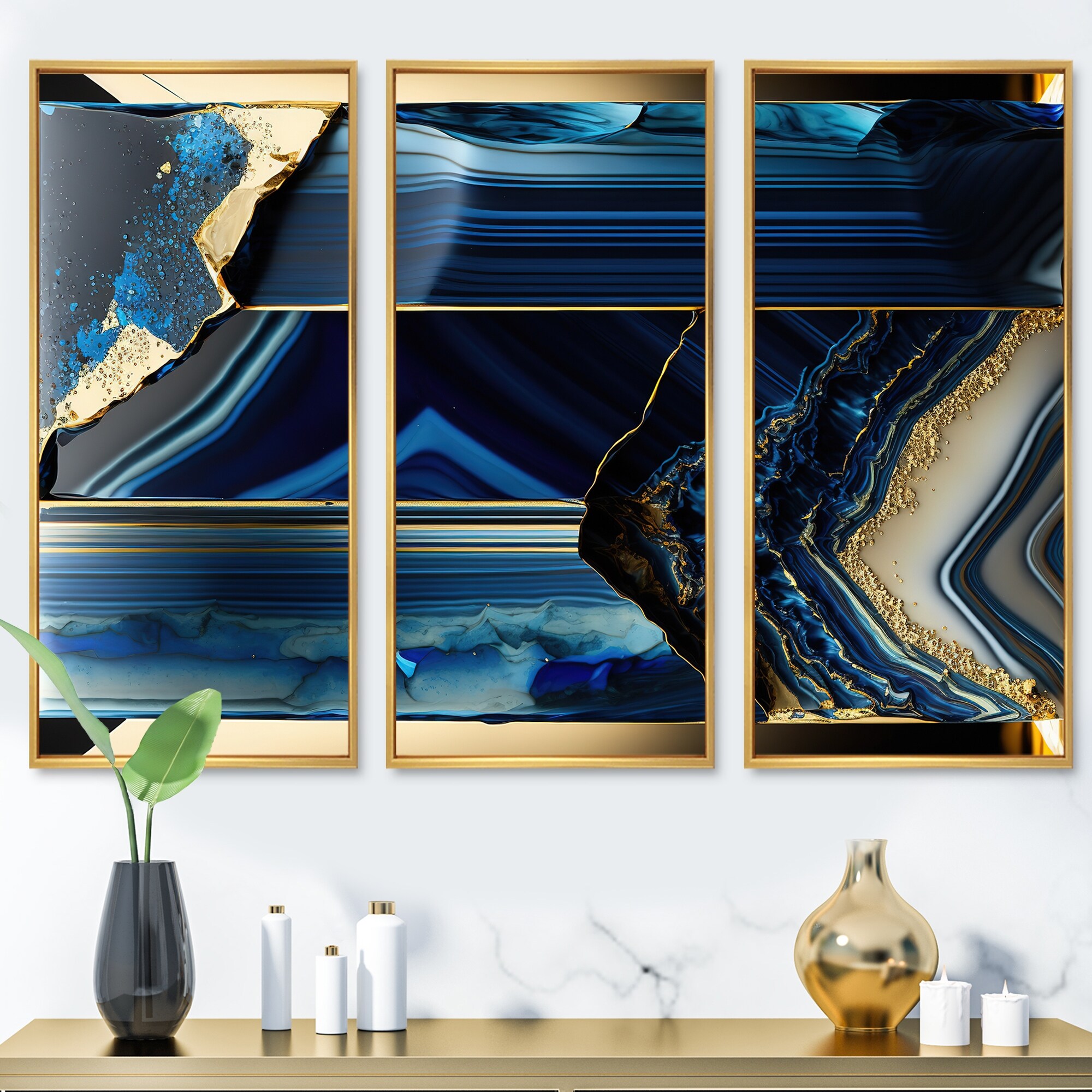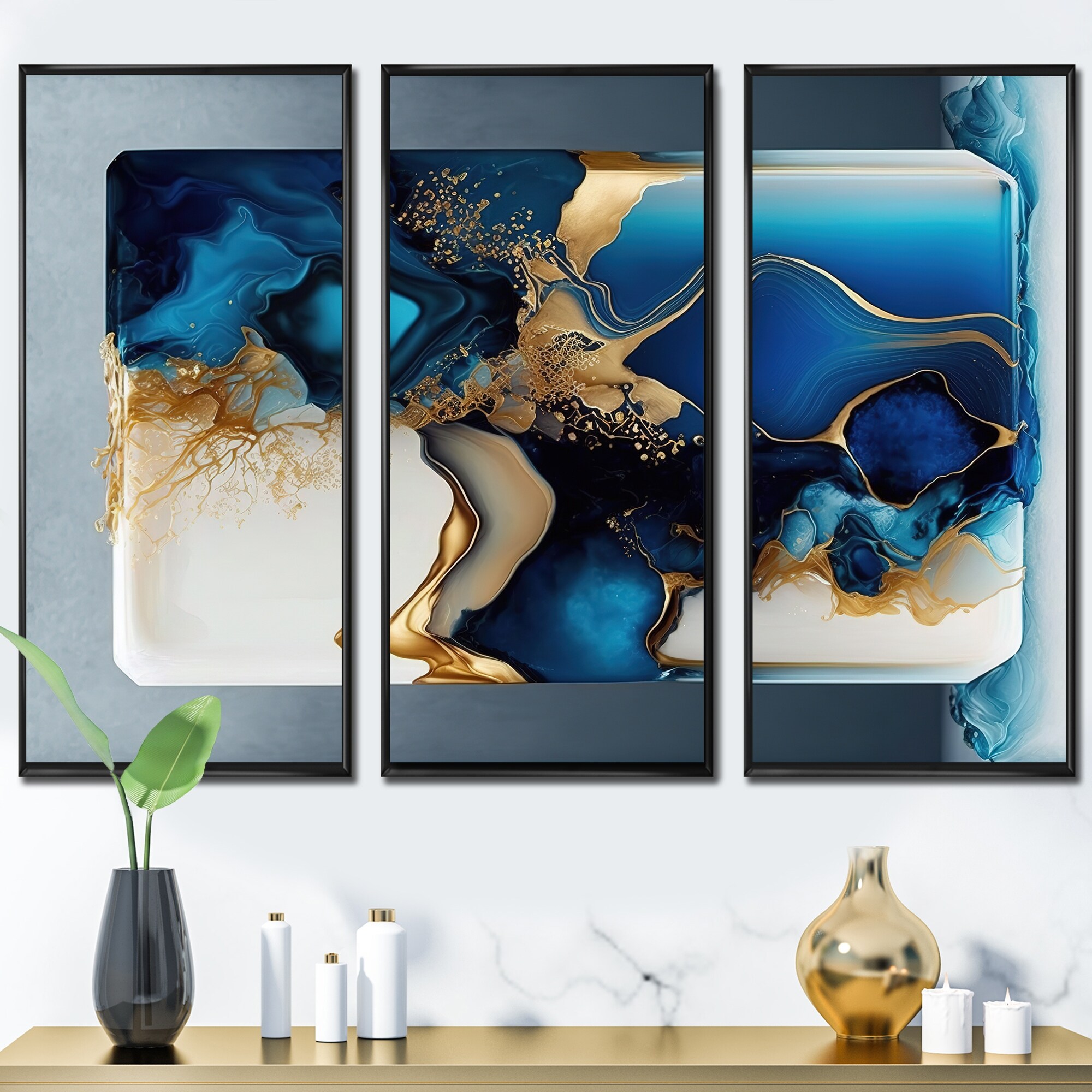 Designart "Abstract Geode Gold And Blue Marble III" Abstract Marble Framed Canvas Art Print - 3 Panels