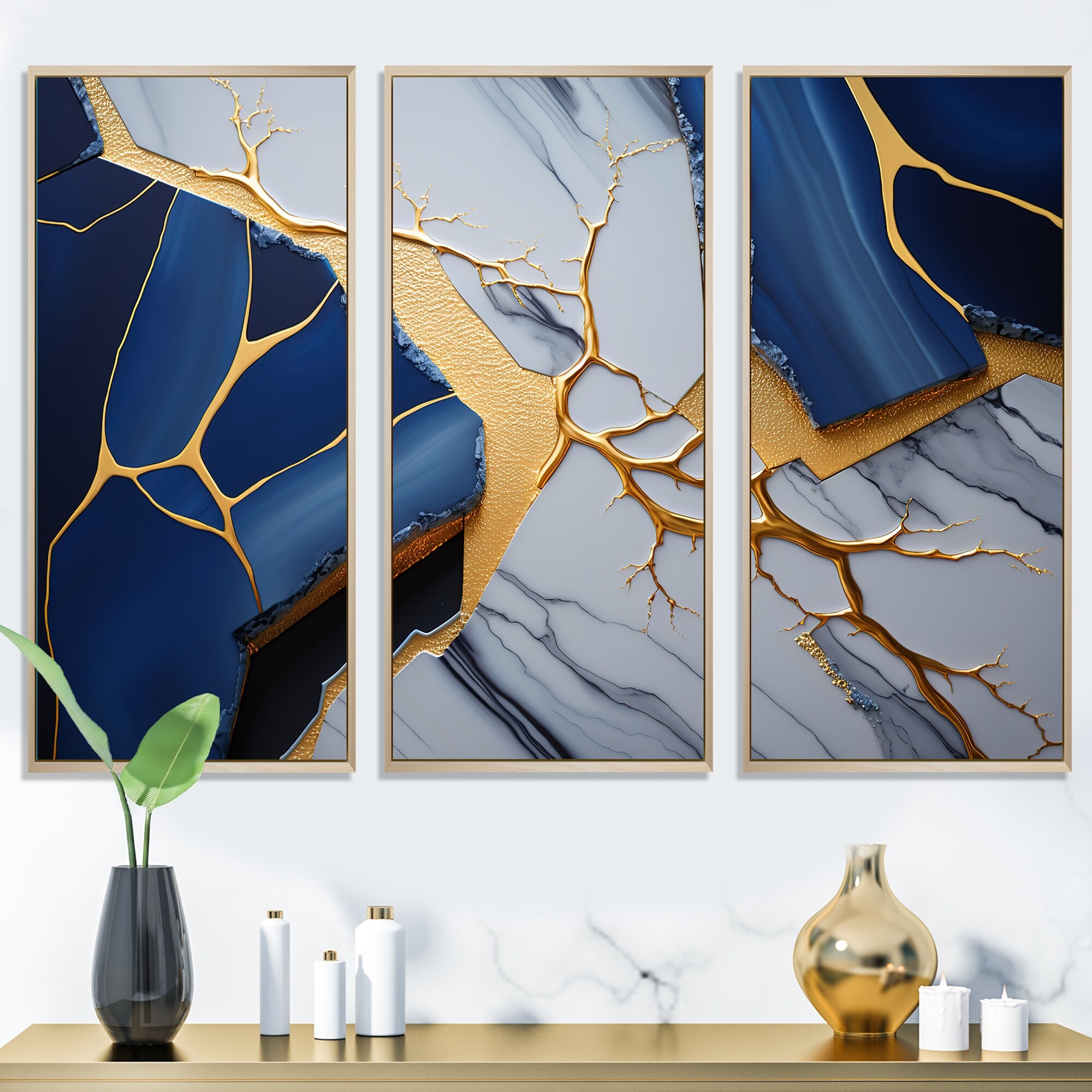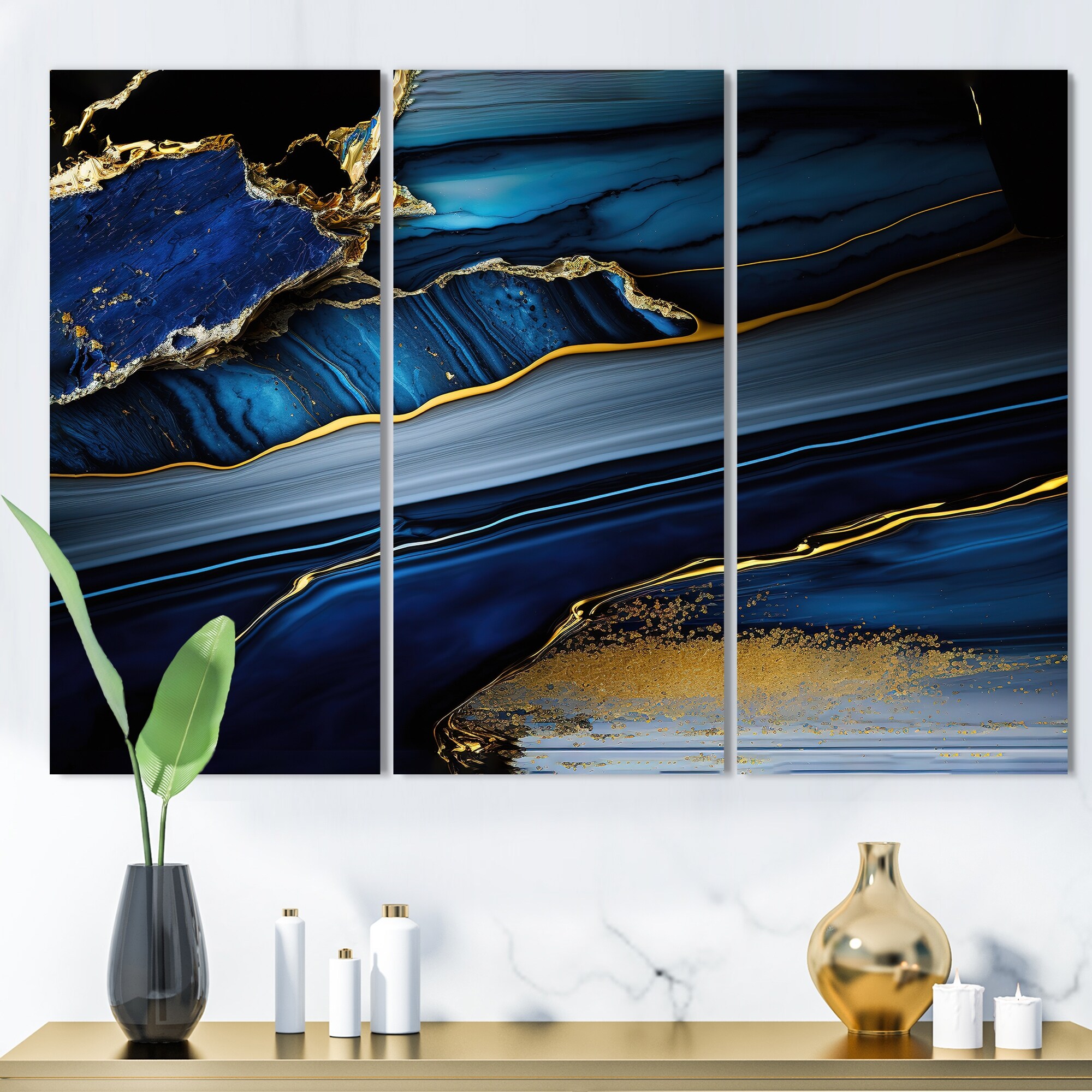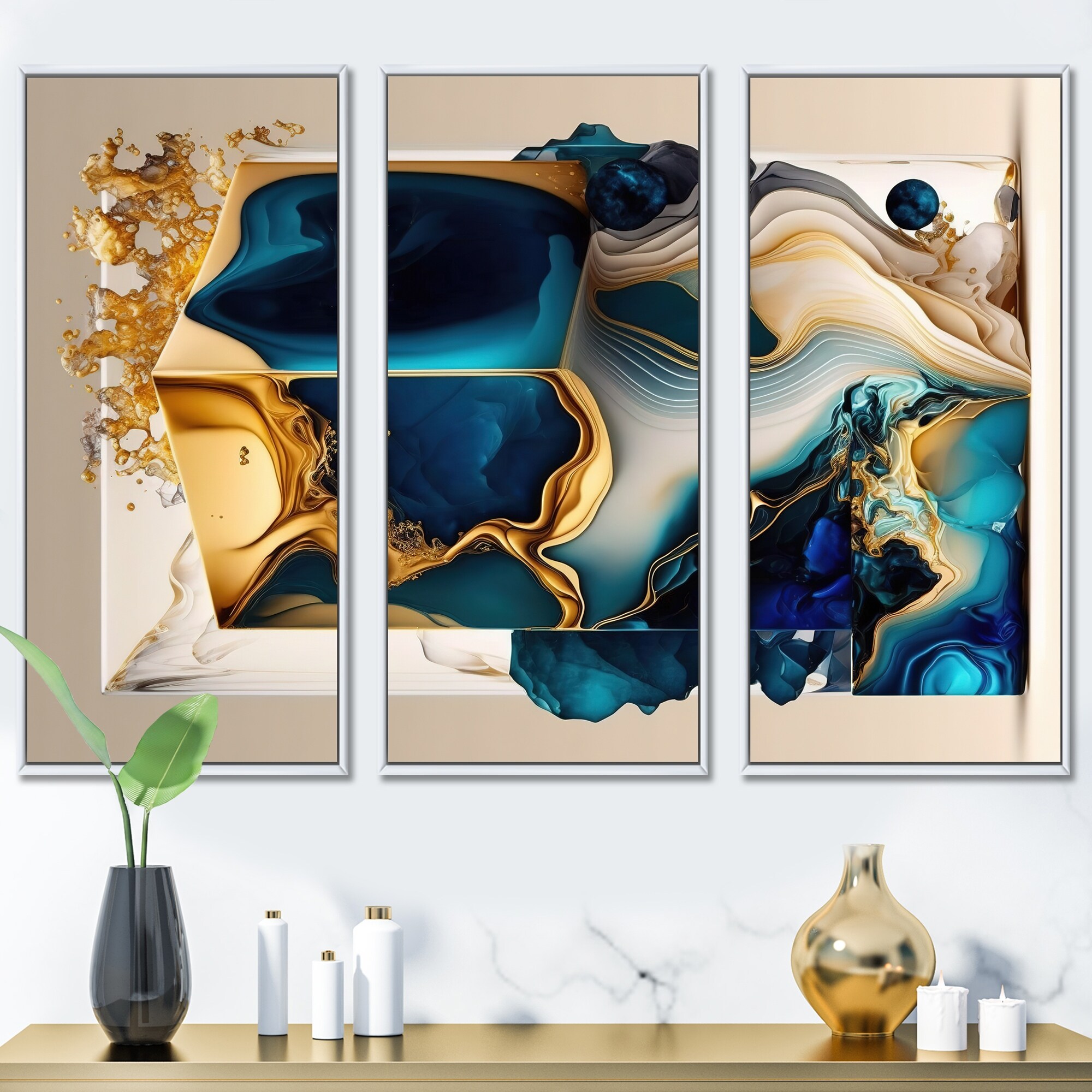 Designart "Abstract Geode Gold And Blue Marble III" Abstract Marble Framed Canvas Art Print - 3 Panels
