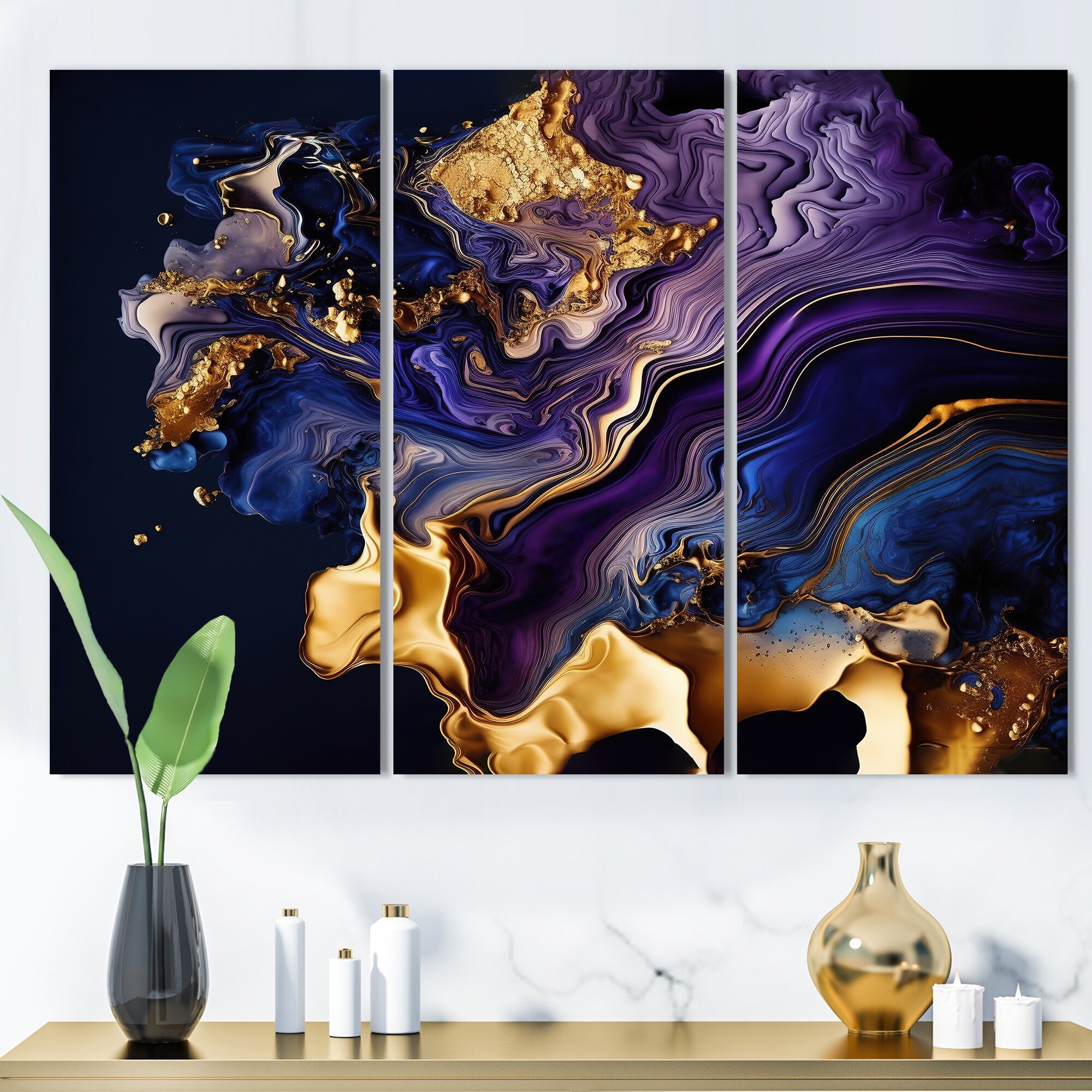 Designart "Abstract Marble Geode Purple I" Abstract Liquid Ink Canvas Art Print - 3 Panels