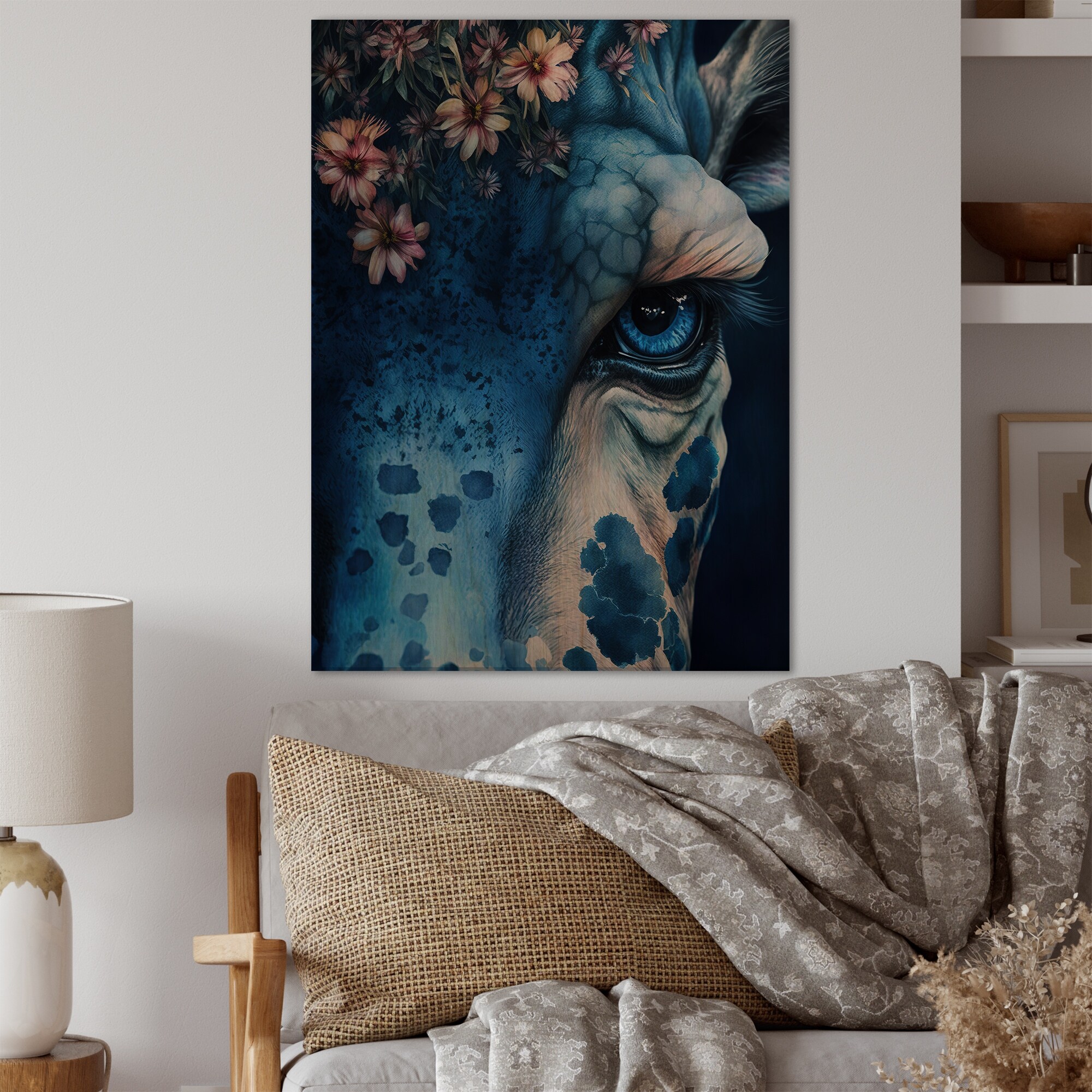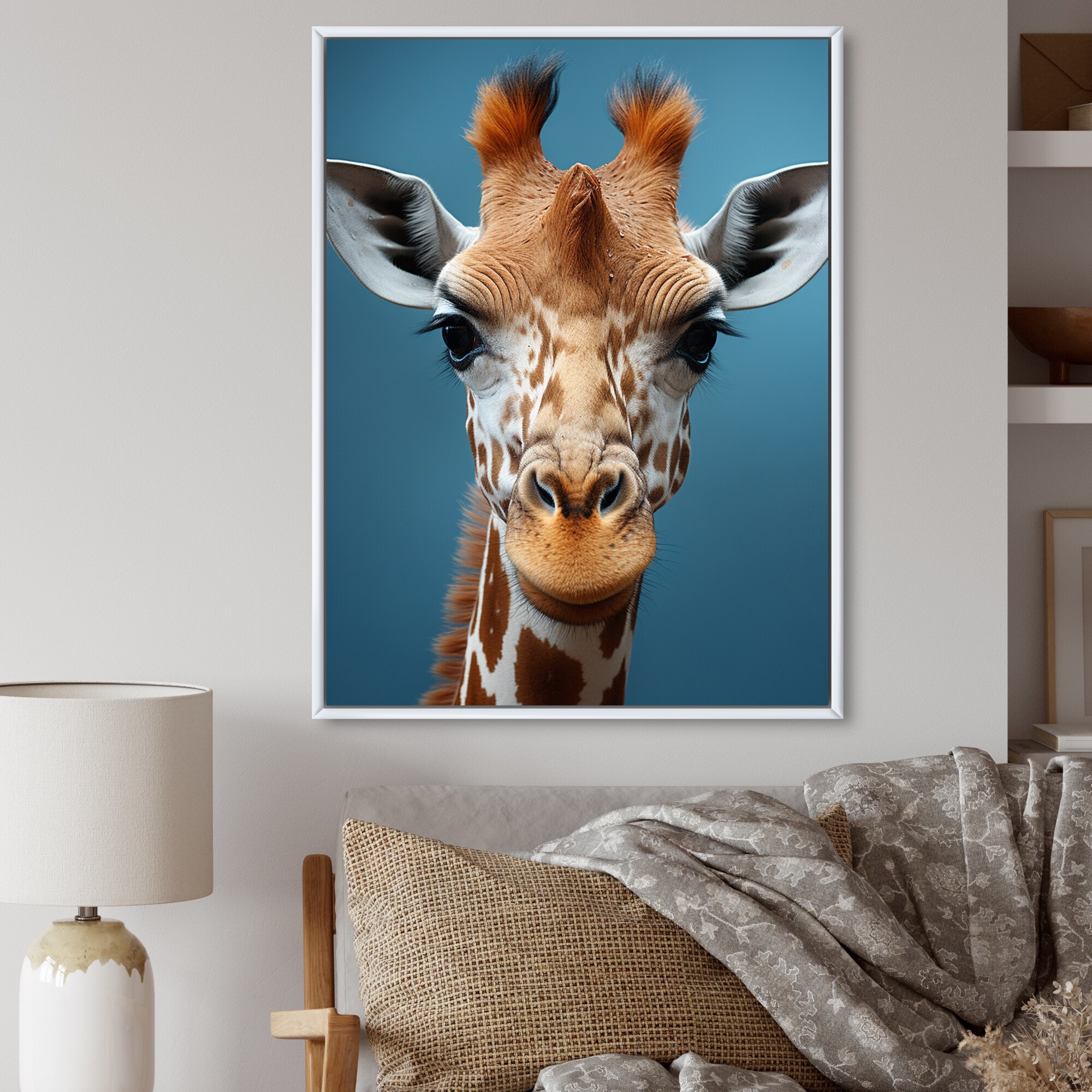 Designart "Blue Giraffe Portrait II" Animals Giraffe Framed Wall Art Prints