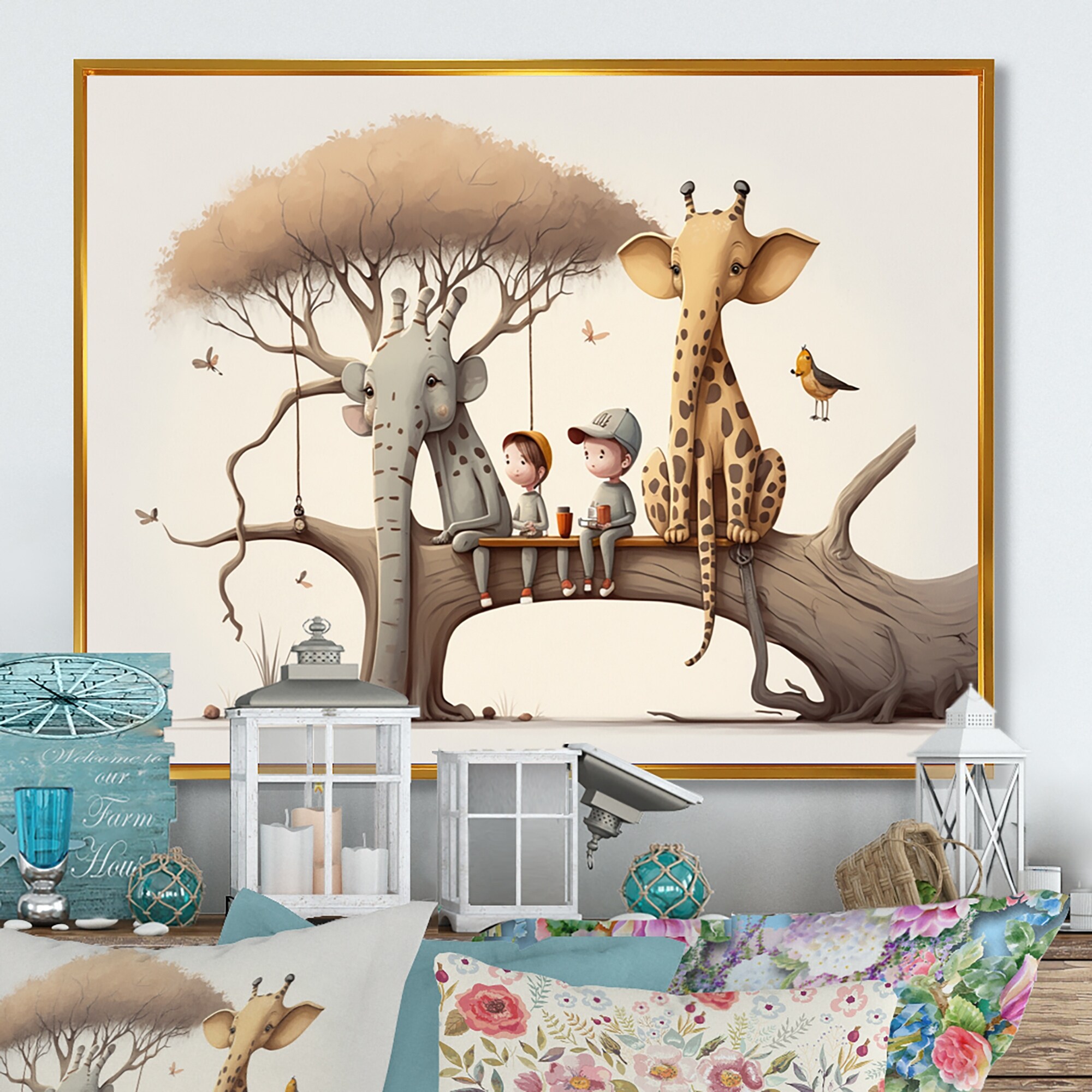 Designart "Portrait of a Giraffe and Child" Farmhouse Framed Canvas Wall Art Print