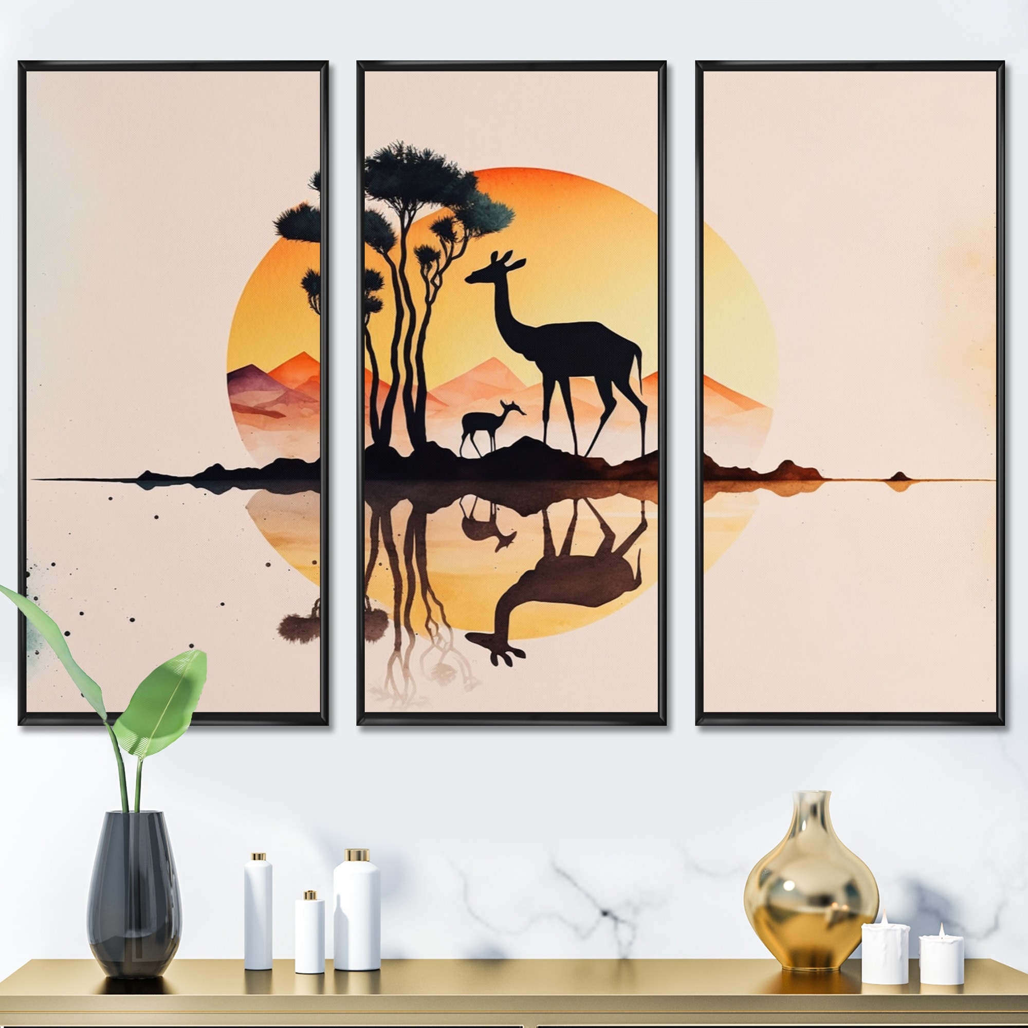 Designart "Giraffe At Sunset" Animals Giraffe Framed Canvas Wall Art Print - 3 Panels