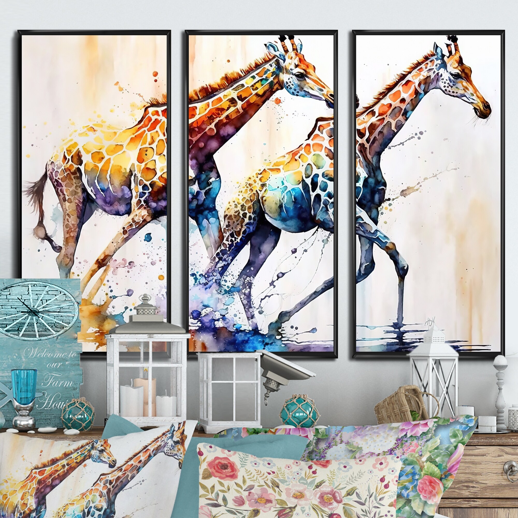 Designart "Portrait of a Giraffe With Flowers II" Farmhouse Framed Canvas Wall Art Print Set of 3 - 4 Colors of Frames