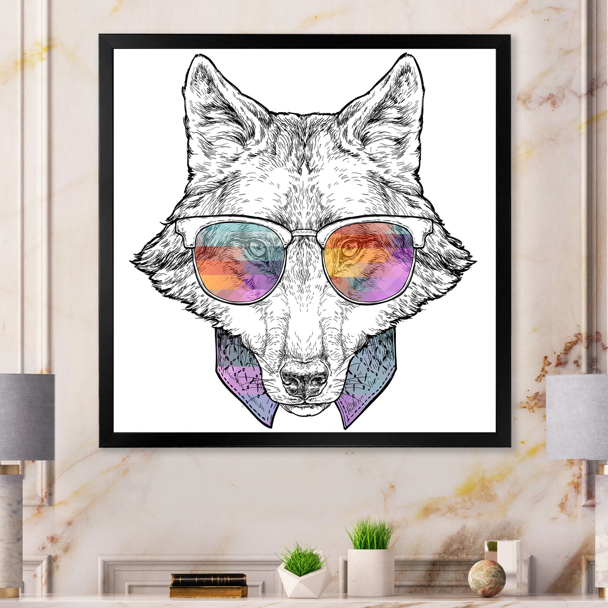 Designart "Colorful Portrait Wolf Glasses" Children's Art Framed Wall Art