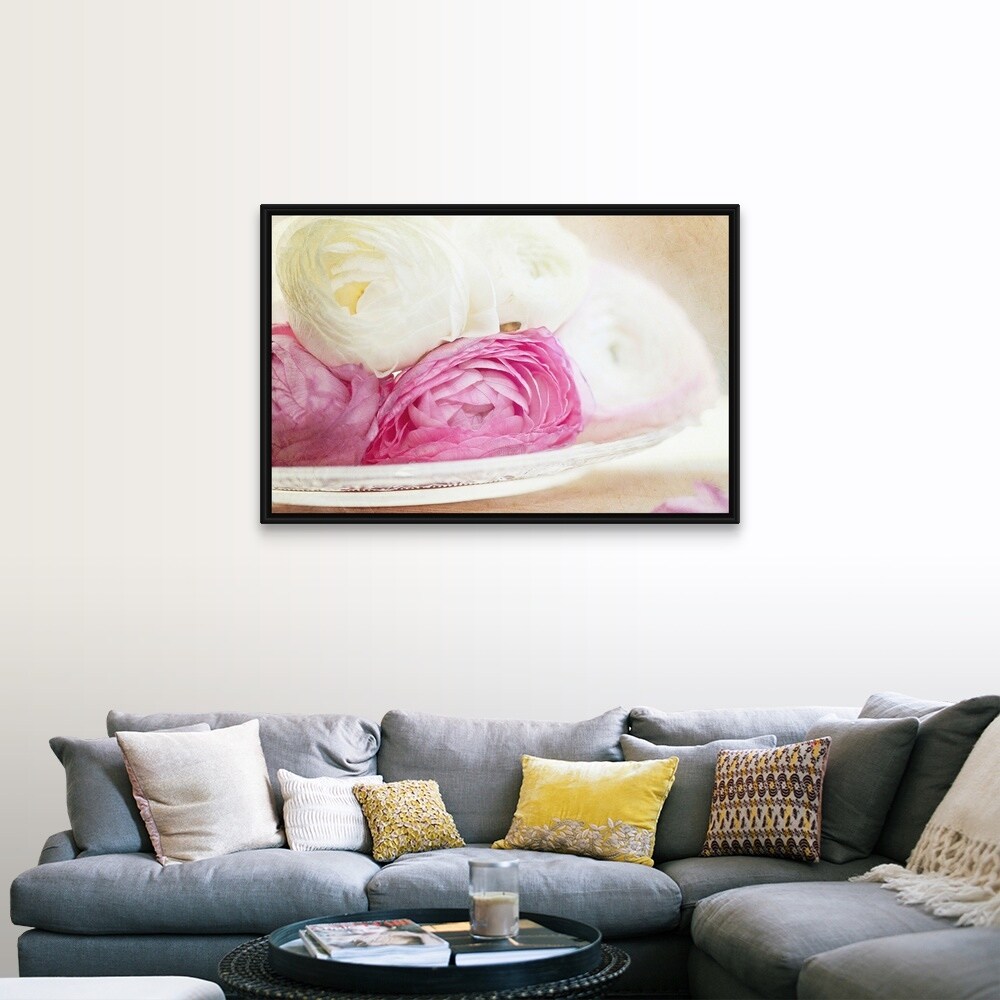 "Pink and white ranunculus flowers in glass plate." Black Float Frame Canvas Art