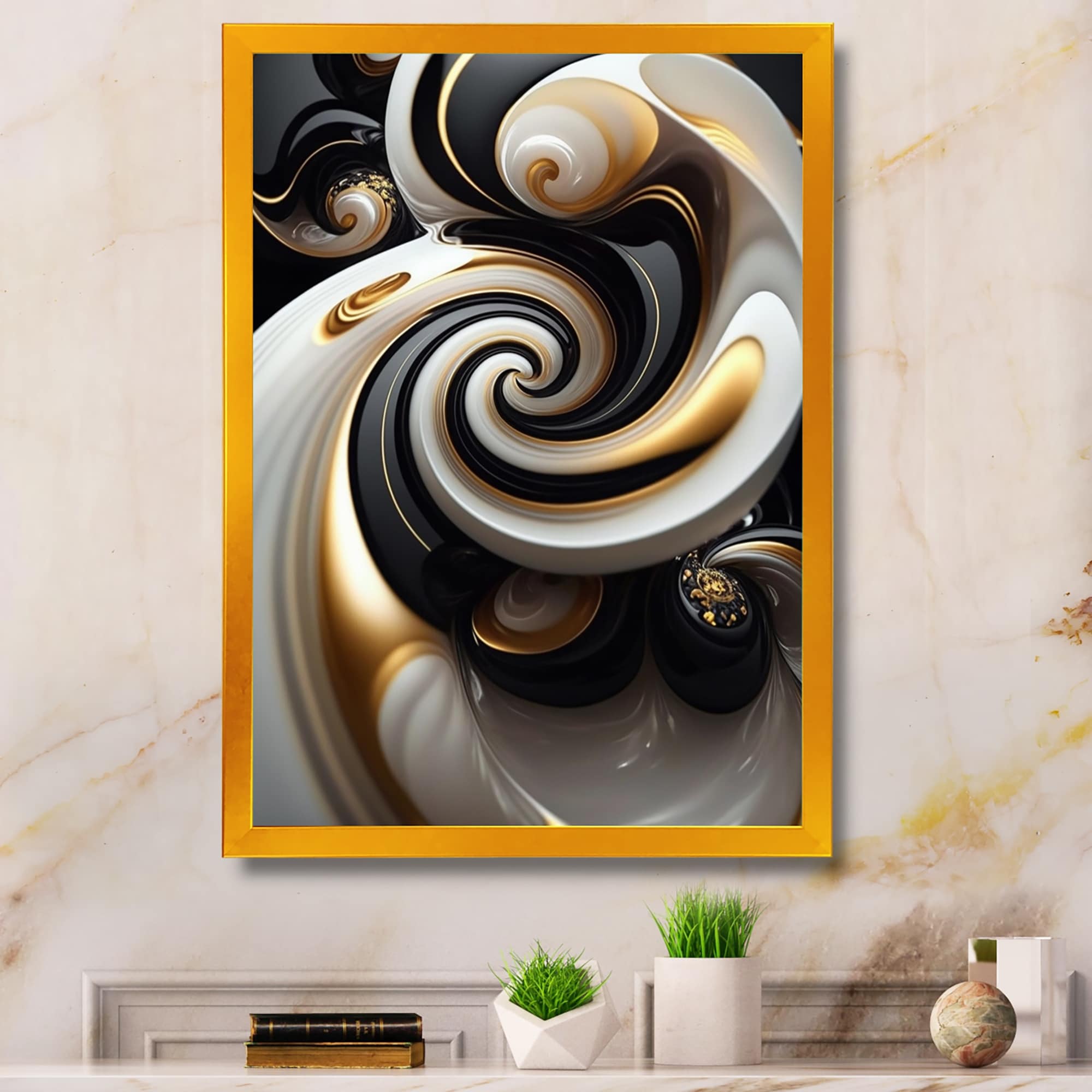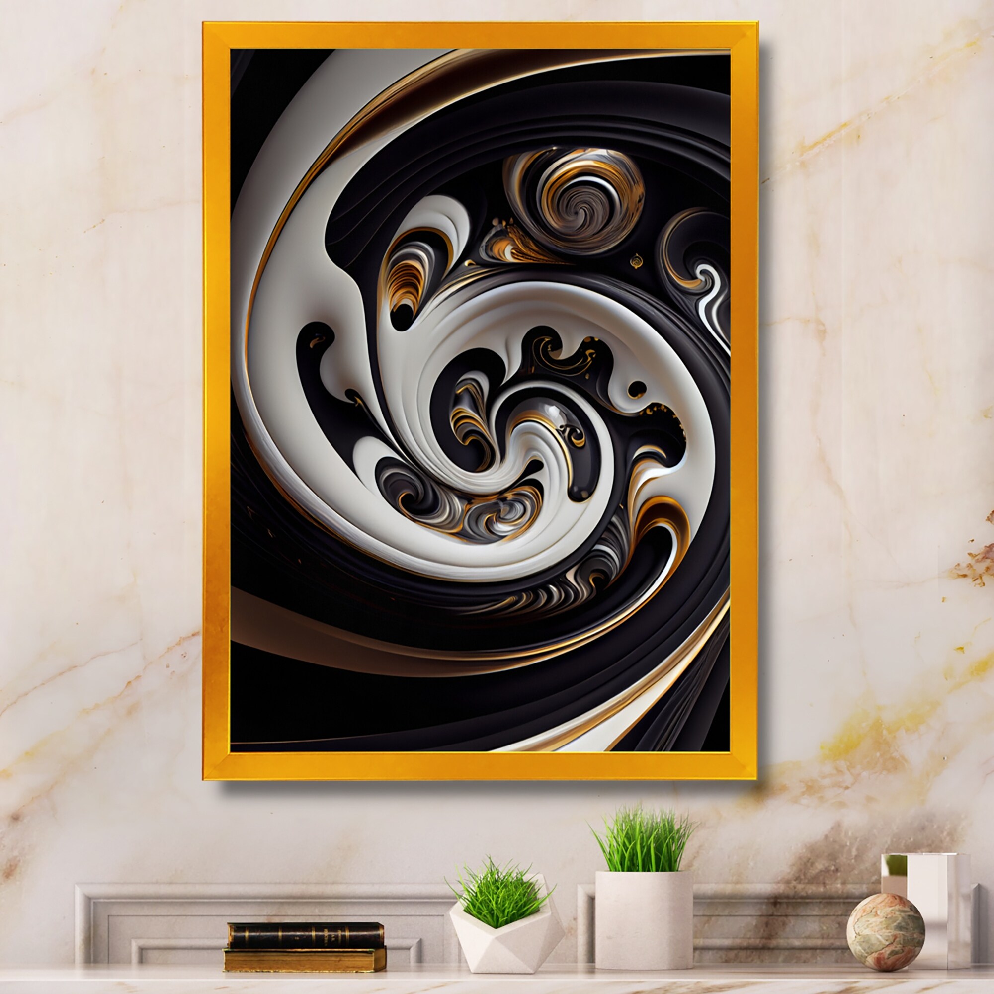 Designart "Gold And Black Stained Glass Spiral VI" Modern Framed Art Print