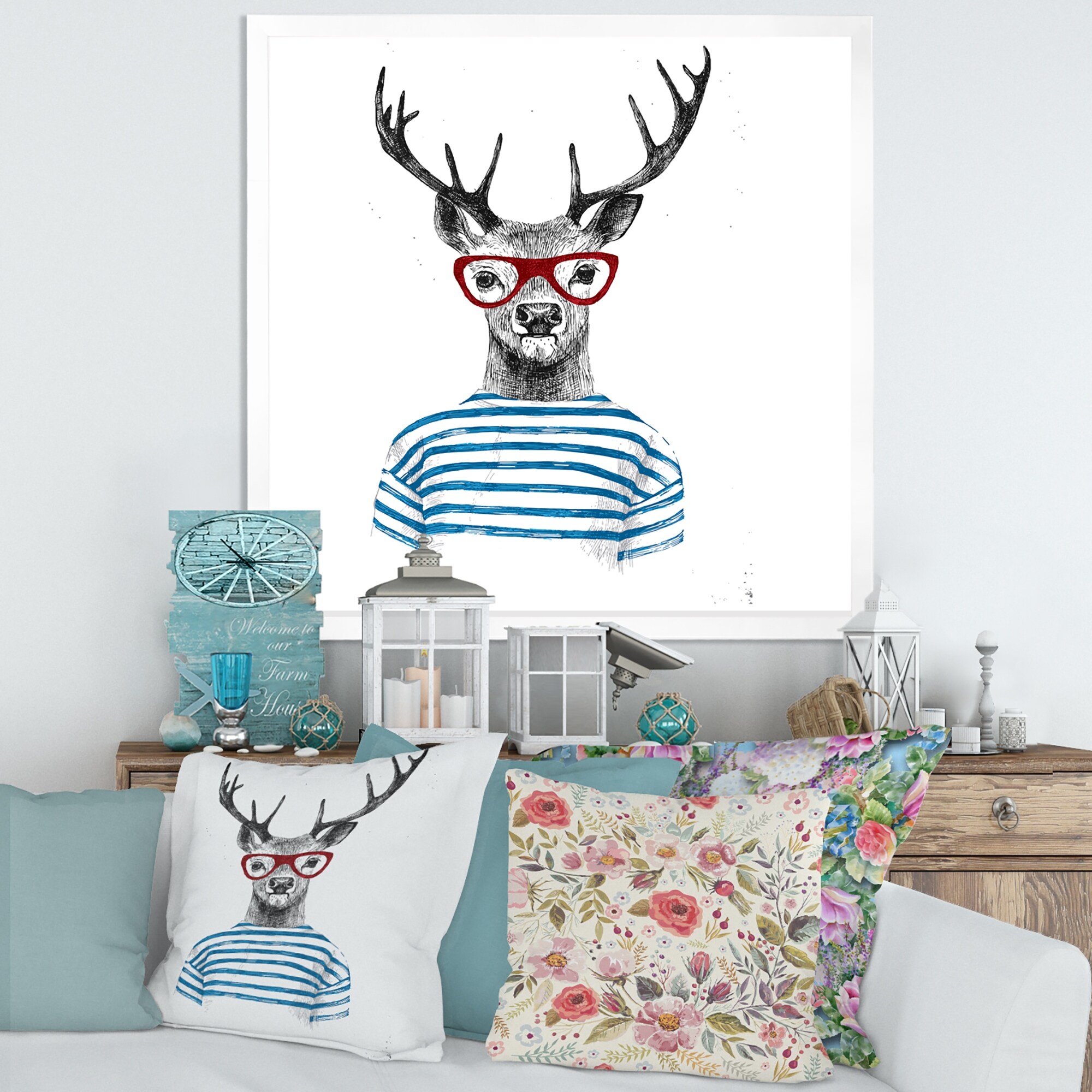 Designart "Portrait Of a Christmas Deer With Red Glasses" Farmhouse Framed Art Print