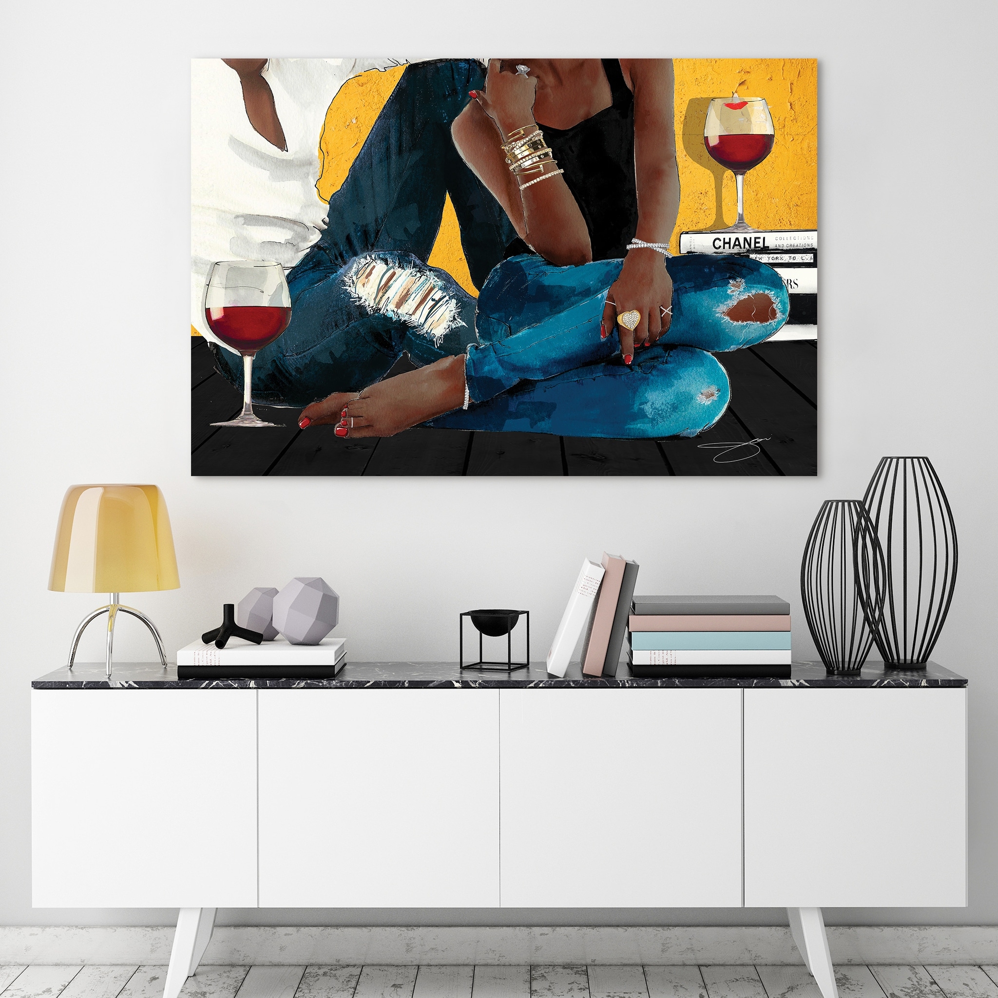 "Italian with love", Italian Glass and Bottle Modern White Framed Canvas Wall Art Print for Dining Room