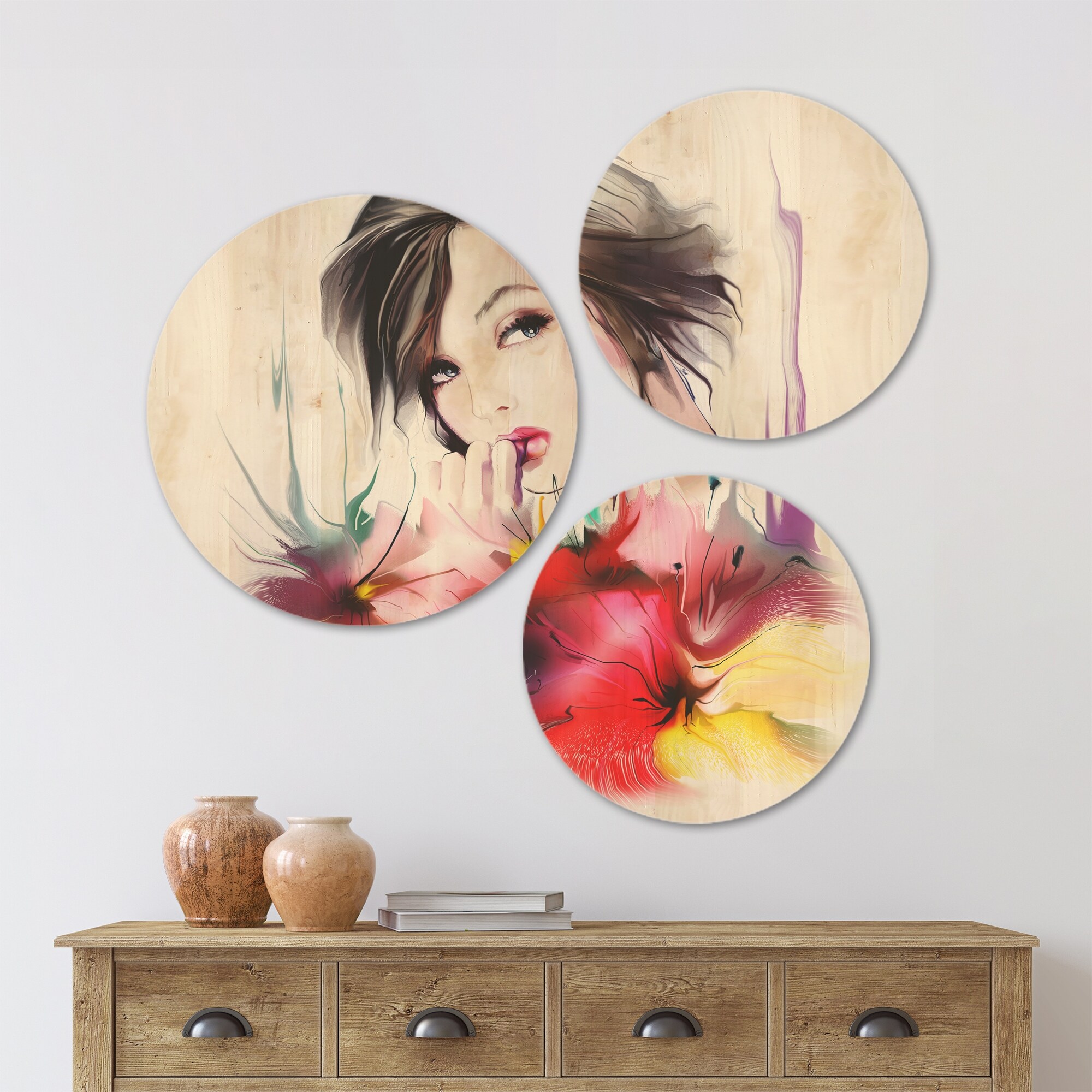 Designart 'Beautiful Woman with Black Hair' Abstract Portrait Wood Wall Art Set of 3 Circles