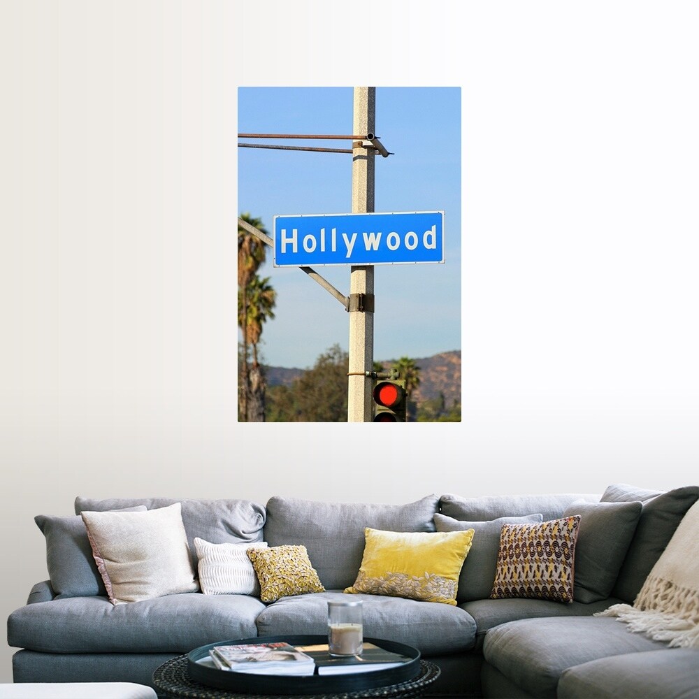 "Close-up of a blue street sign on a lamppost for Hollywood." Poster Print - Multi