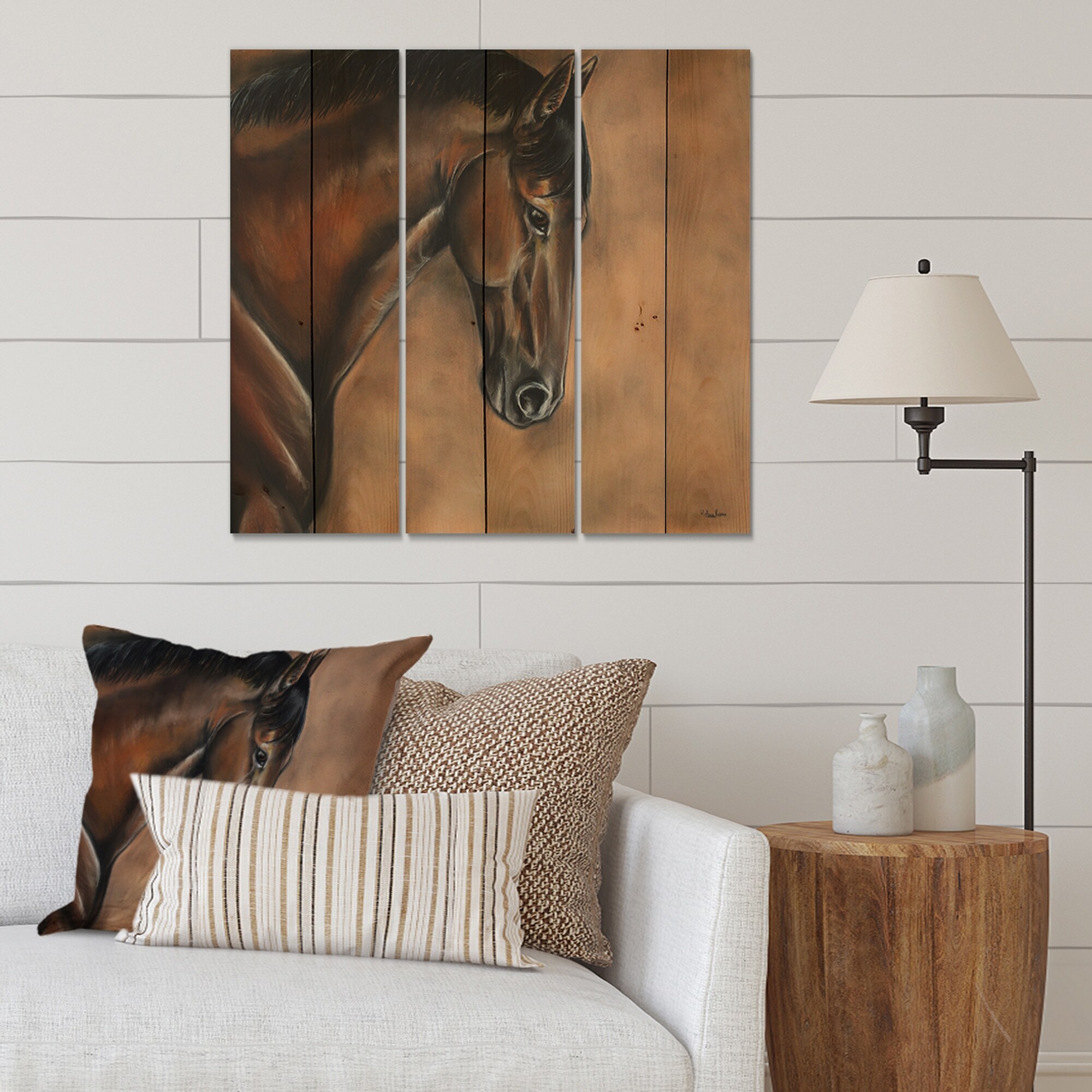 Designart 'Portrait Of a Brown Bay Horse' Farmhouse Print on Natural Pine Wood - 3 Panels