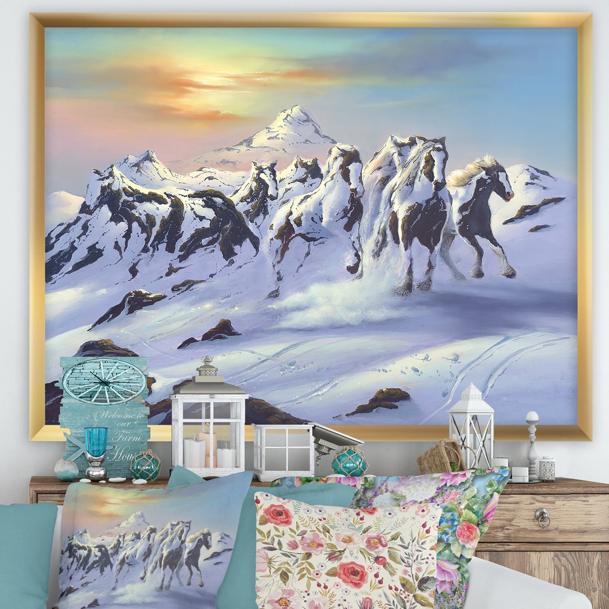 Designart "Horses In the Snow" Cottage Framed Art Print