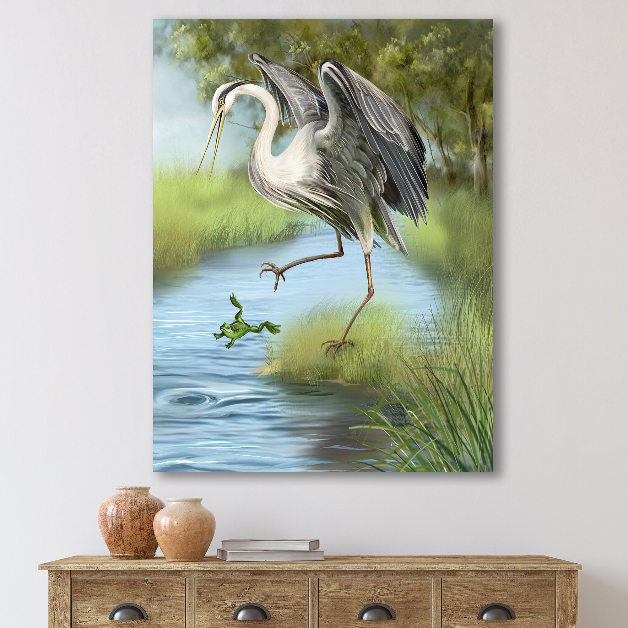 Designart "Crane Hunting A Frog in the Water" Farmhouse Canvas Wall Art Print