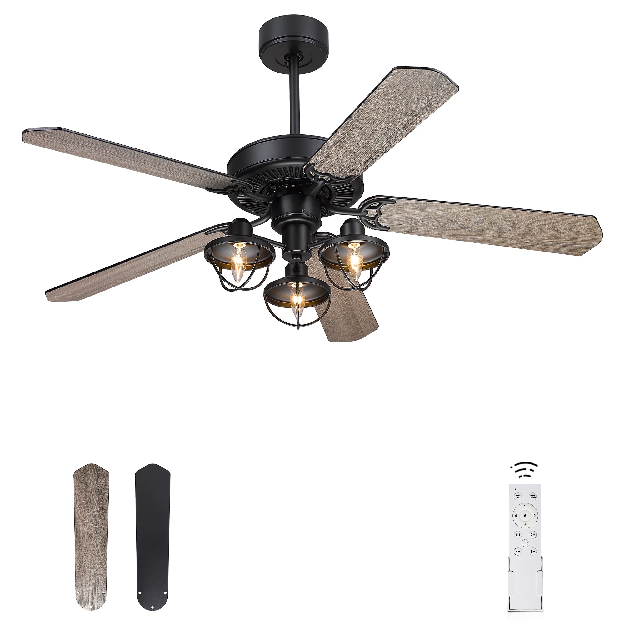 52-Inch Farmhouse Wooden Ceiling Fans with 3 Lights and Remote Control, 5-Reversible Blades Indoor/Outdoor