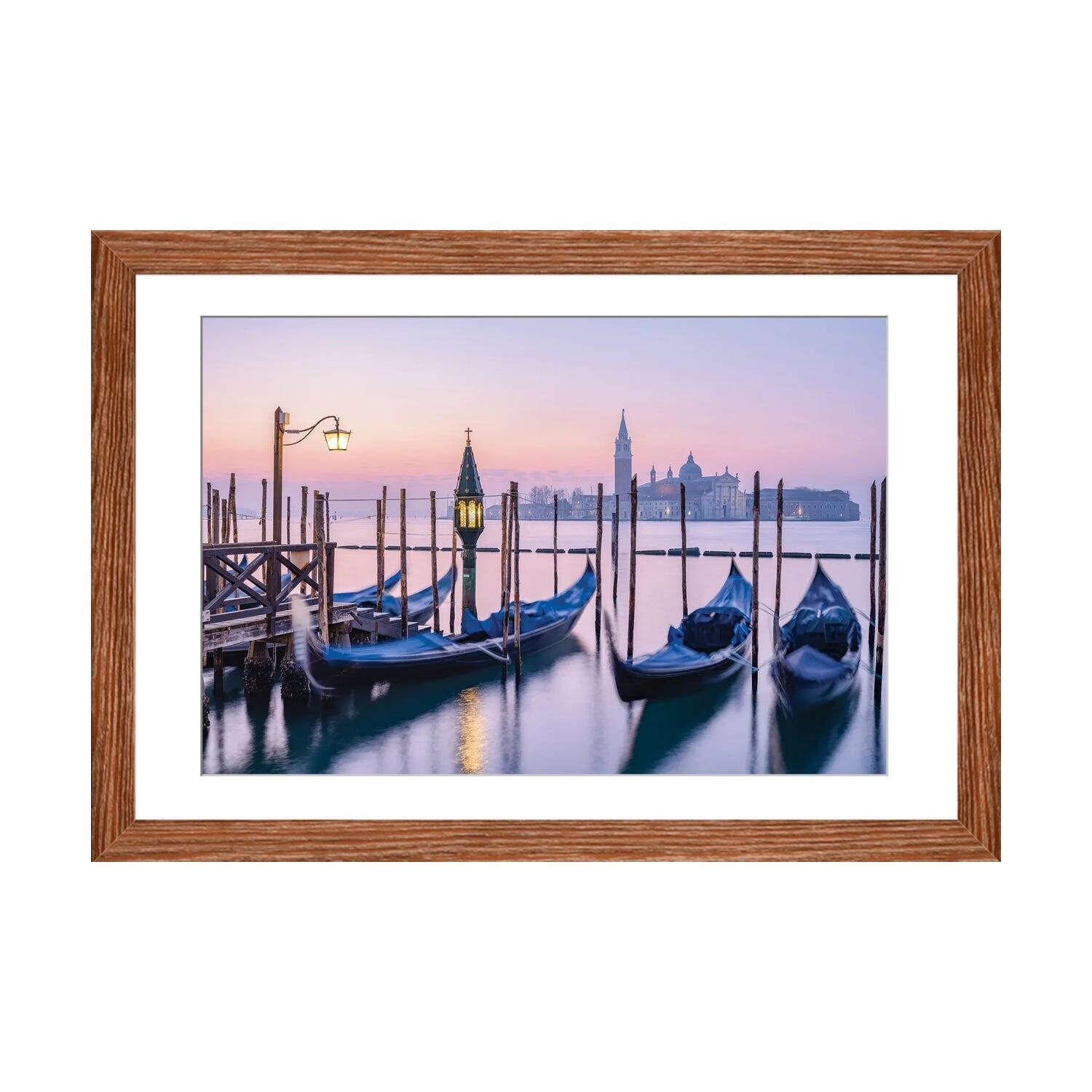 "Row of gondolas moored near a jetty, Venice, Italy" Black Framed Print