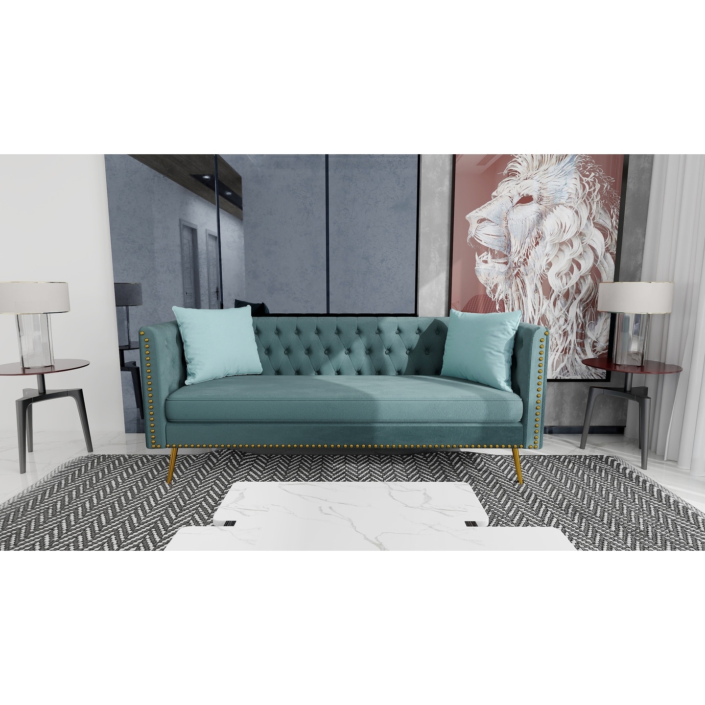 Stylish Velvet Nailhead 3-Seat Sofa with 2 Throw Pillows and Golden Metal Legs