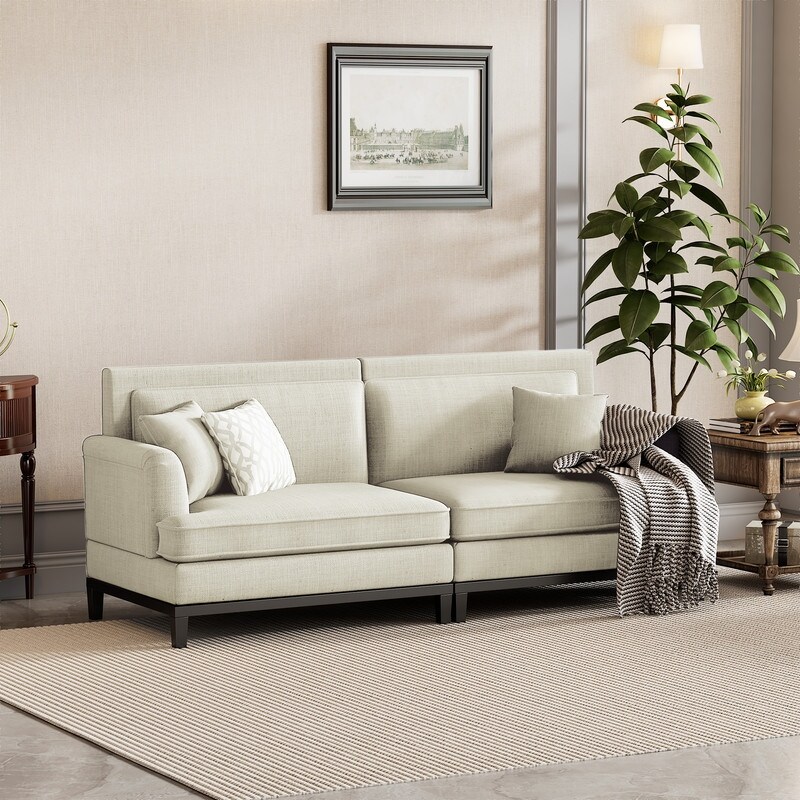Modern Fabric Upholstered Sofa Removable Cushions Couch with 2 Throw Pillows and Wood Frame & Wood Legs for Living Room
