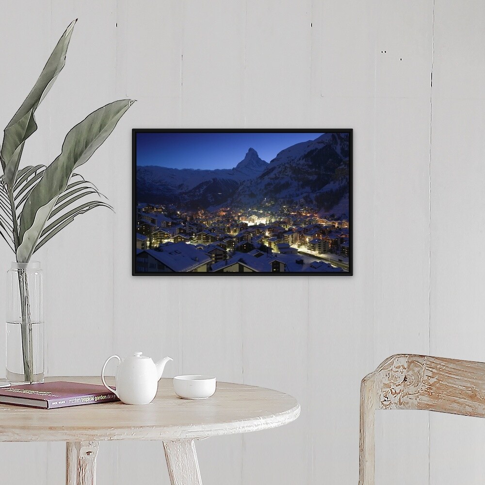 "High angle view of buildings lit up at dusk, Matterhorn, Zermatt, Switzerland" Black Float Frame Canvas Art