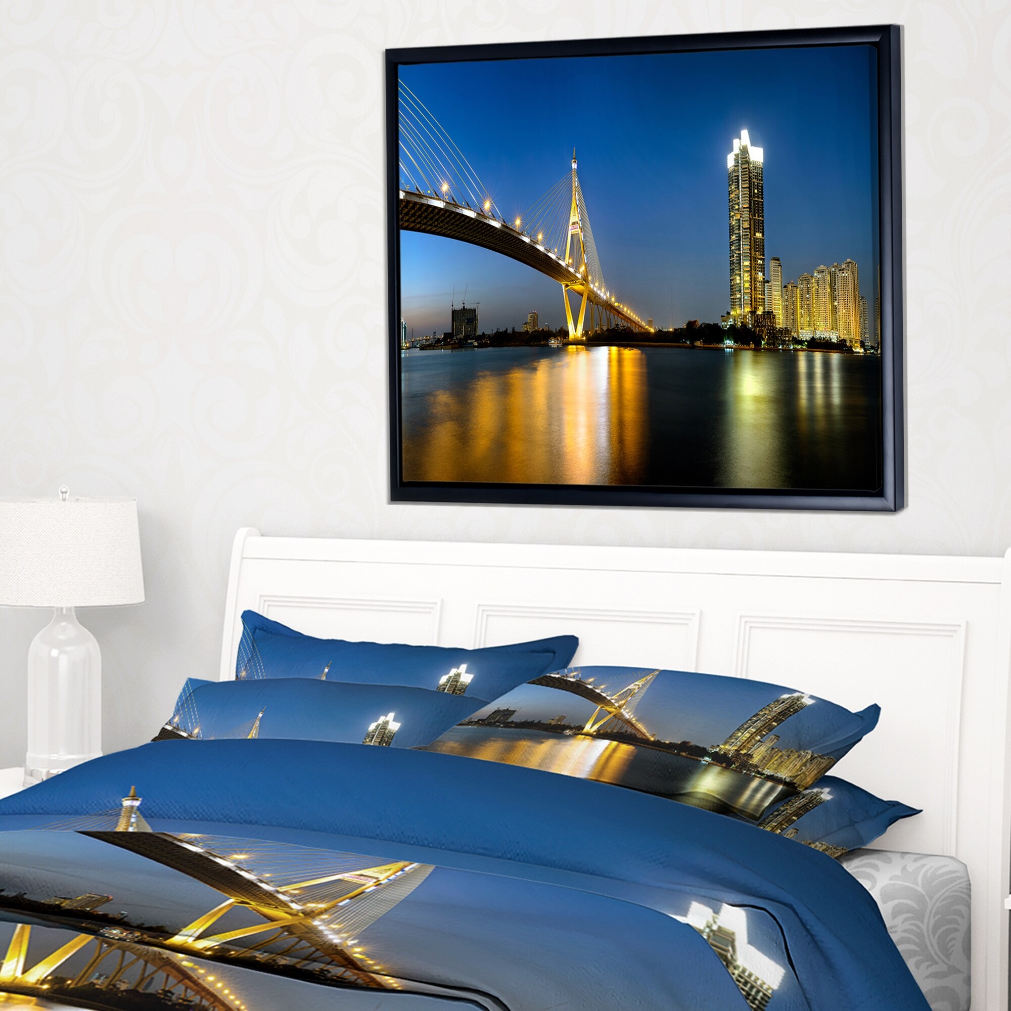 Designart "Lit up Bhumibol Bridge at Dusk" Cityscape Framed Canvas Art Print
