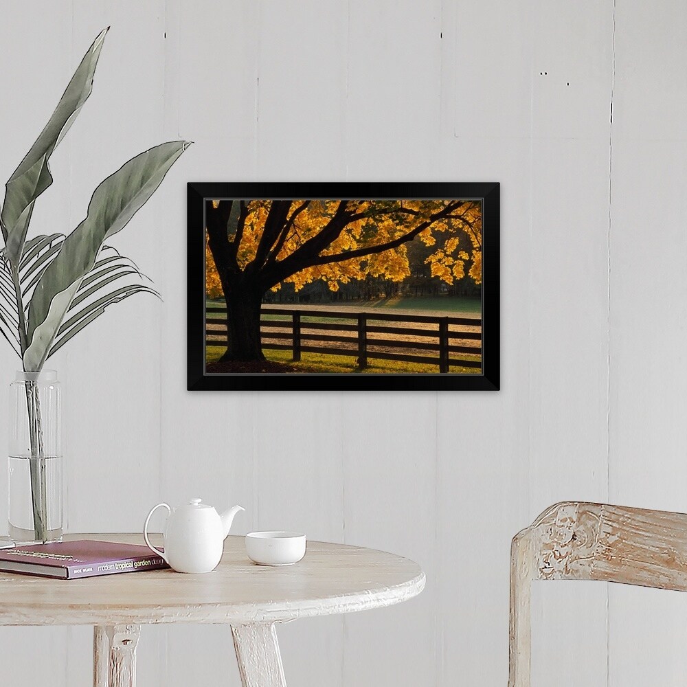 "Back lit autumn color tree and fenceline, Maryland" Black Framed Print