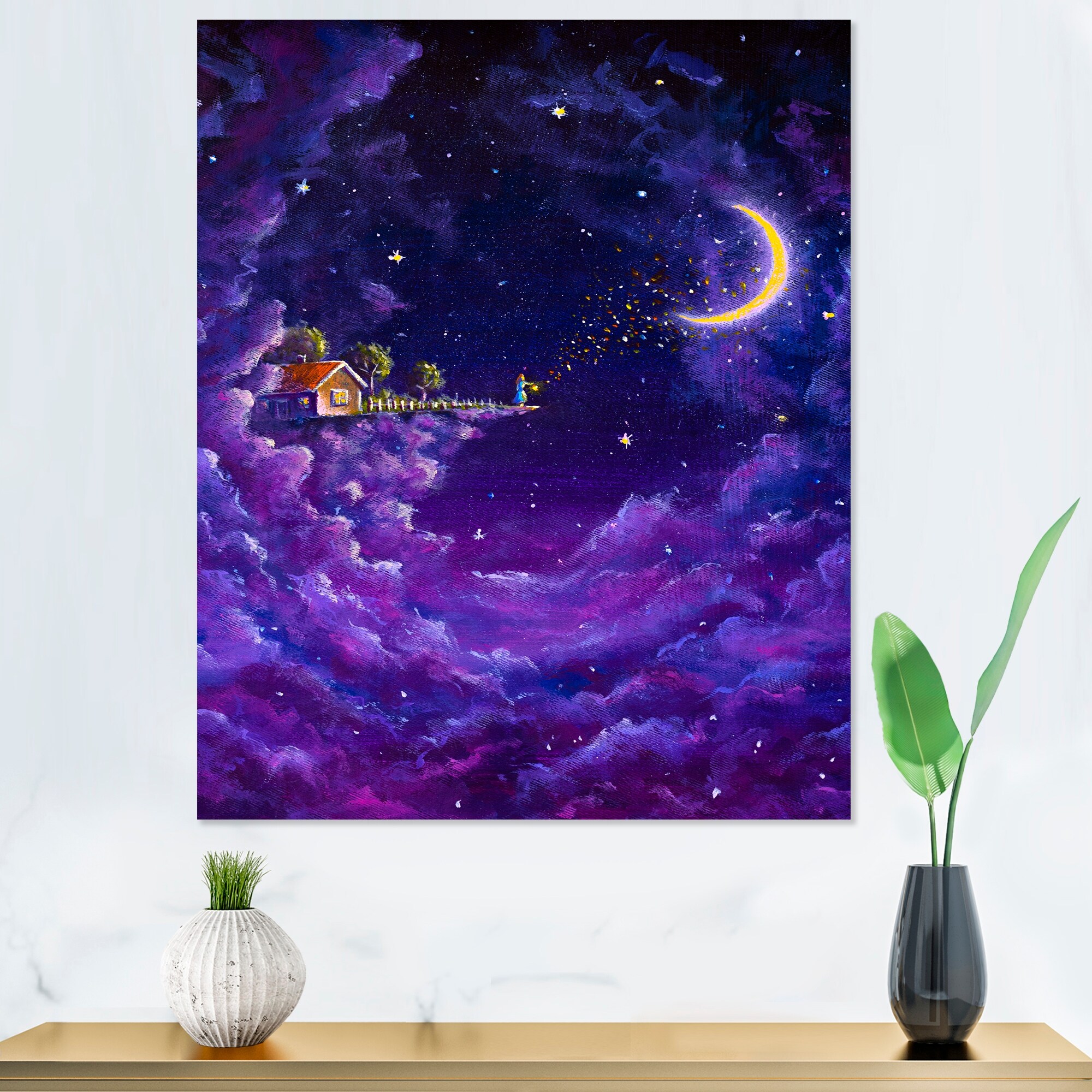 Designart "Little House During Magical Purple Night" Modern Canvas Art Print
