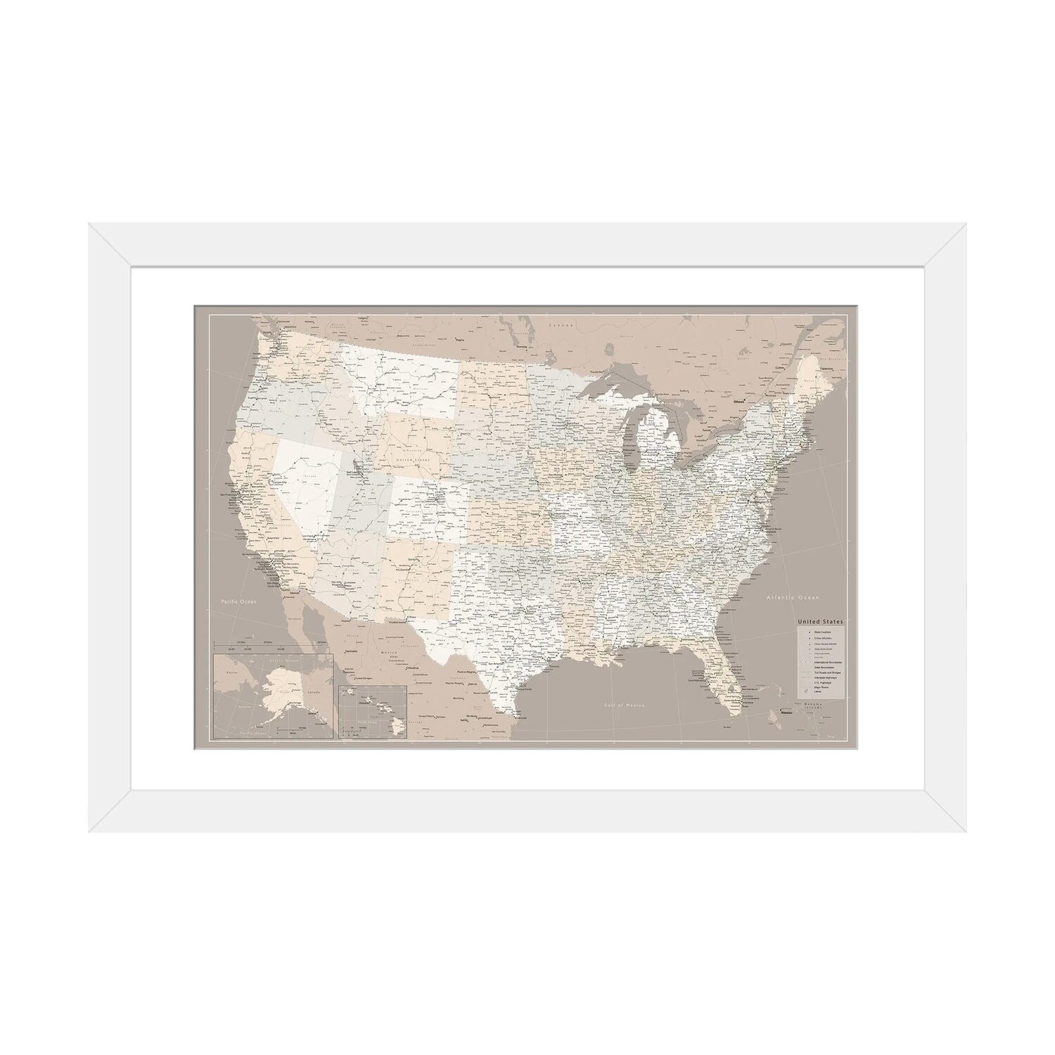 iCanvas "Highly Detailed Map of the Usa, Madelia, Cream, Dusty Pink And Grey" by blursbyai Framed Canvas Print