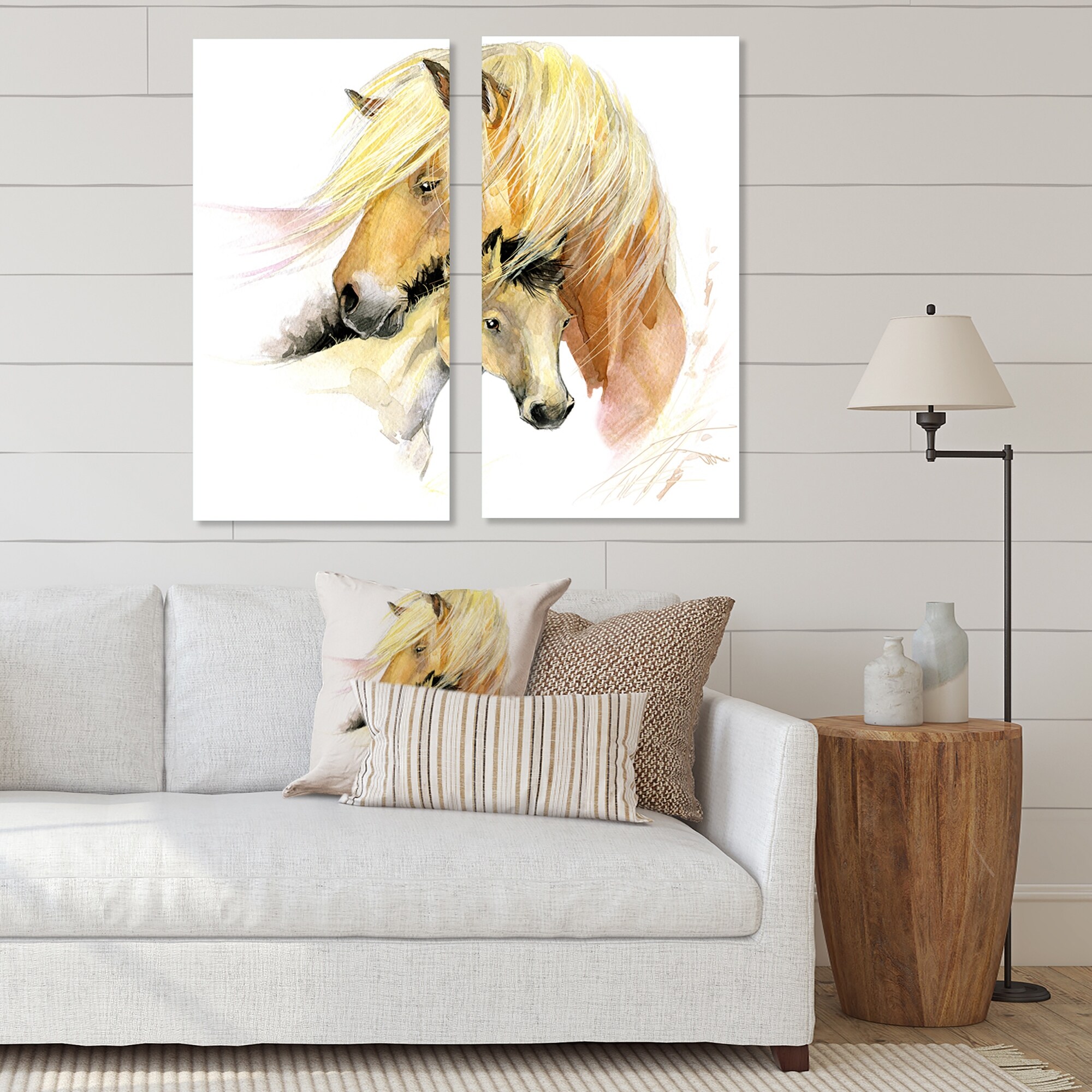 Designart "Horse Mom Baby Watercolor" Animals Canvas Wall Art Print 2 Piece Set
