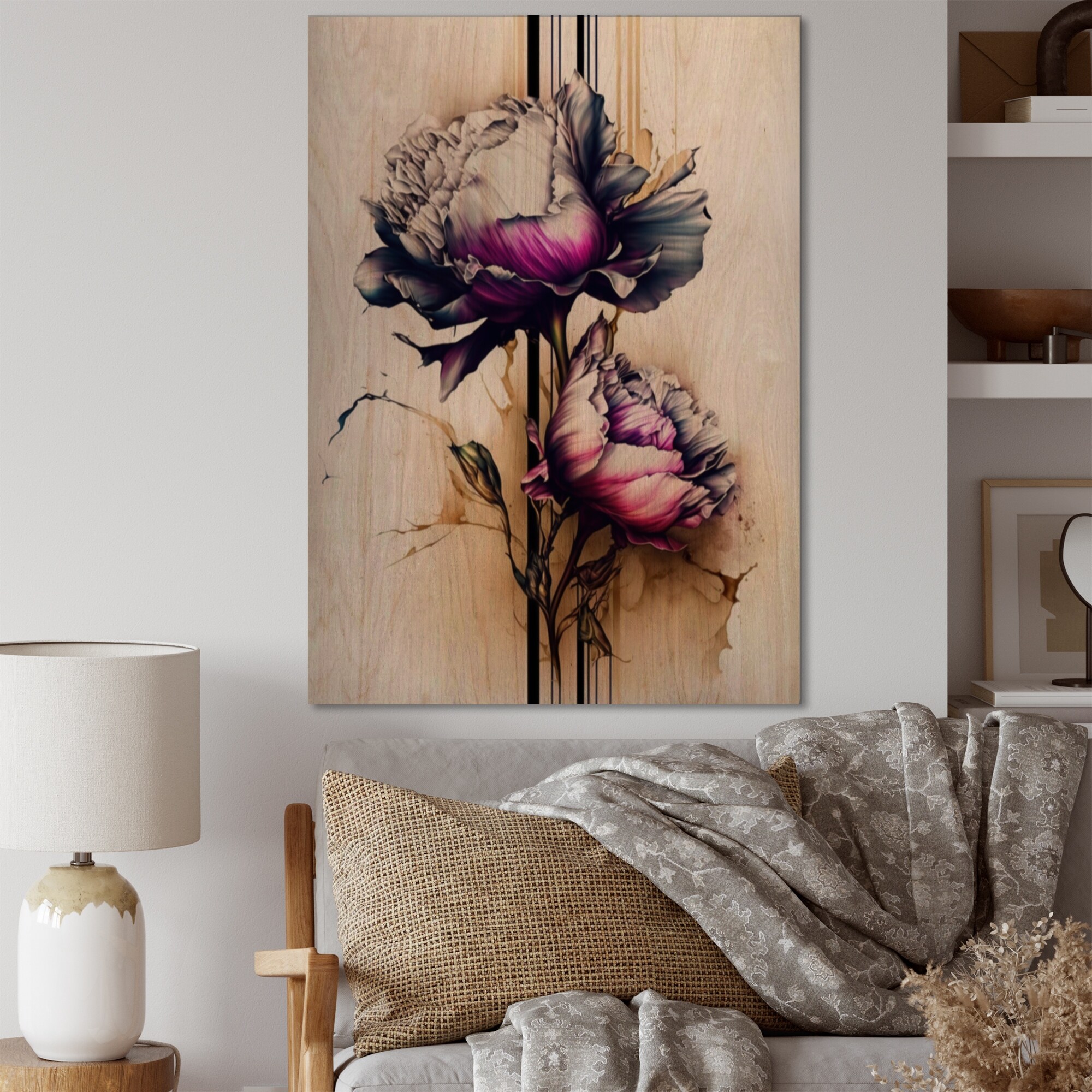Designart 'Pink Peony Flower on Abstract Fusion'Floral Peony Wood Wall Art - Natural Pine Wood