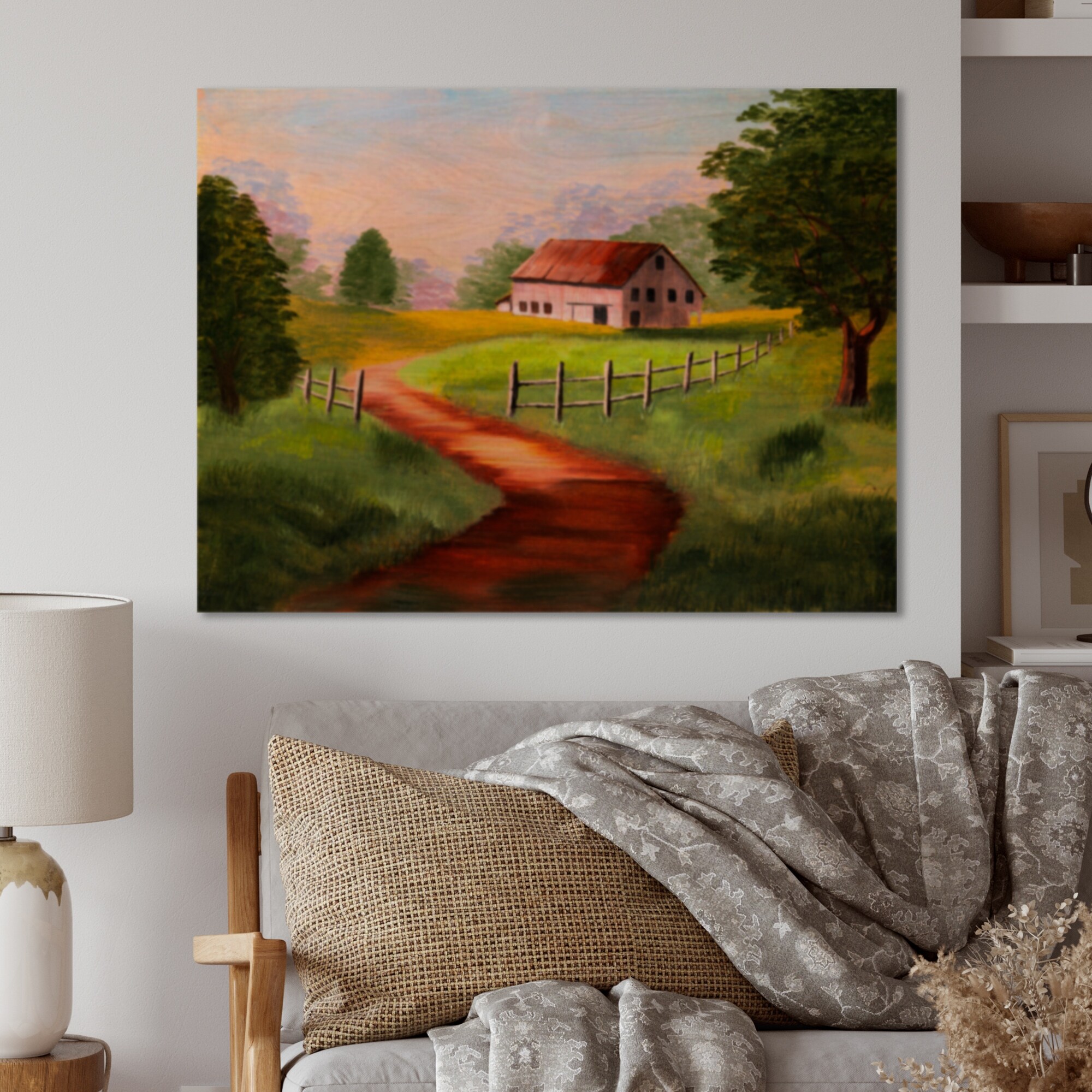 Designart "View From A Cottage Country Door III" Farm Landscape Print on Natural Pine Wood
