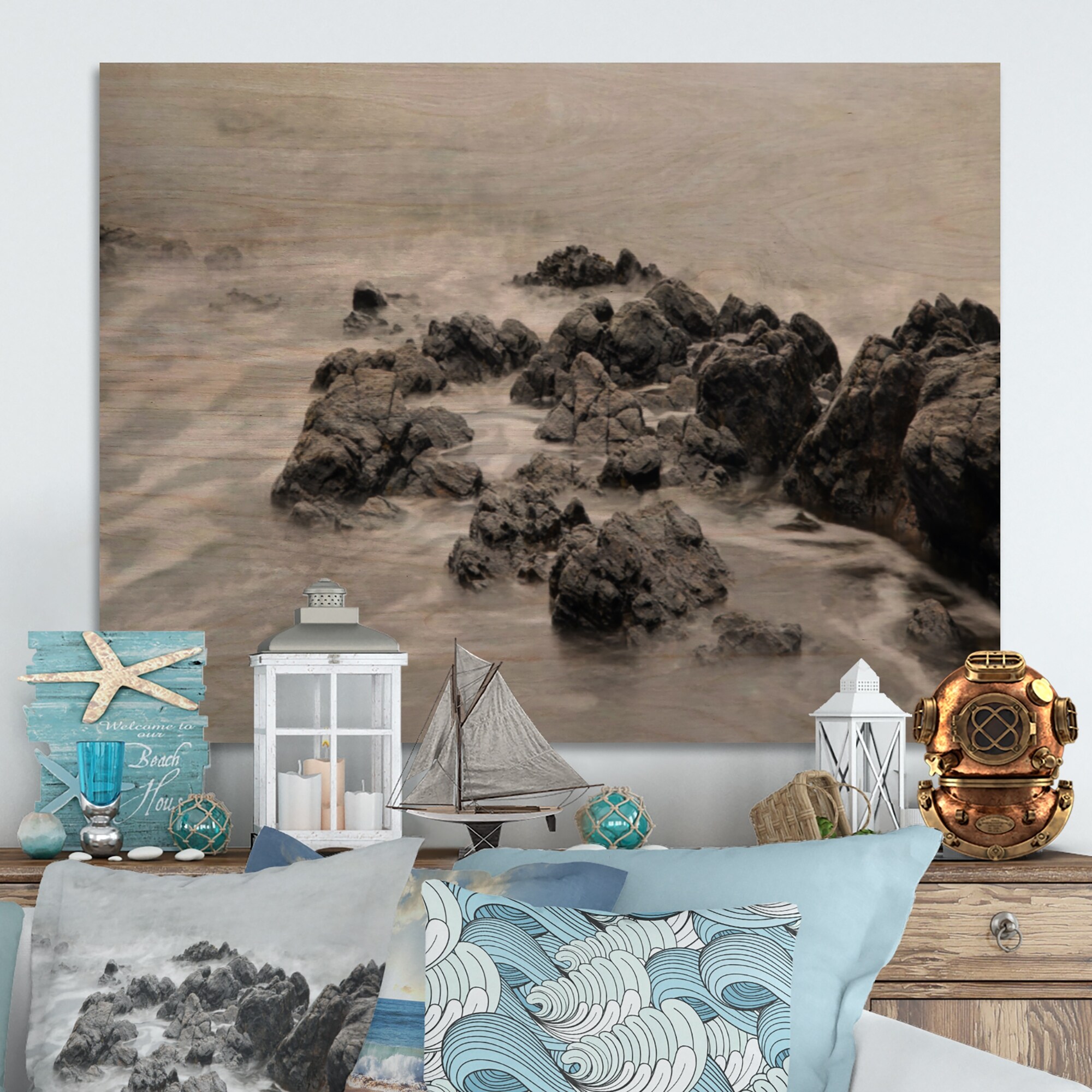 Designart 'Black And White Rocky Coastline' Nautical & Coastal Wood Wall Art Panels - Natural Pine Wood