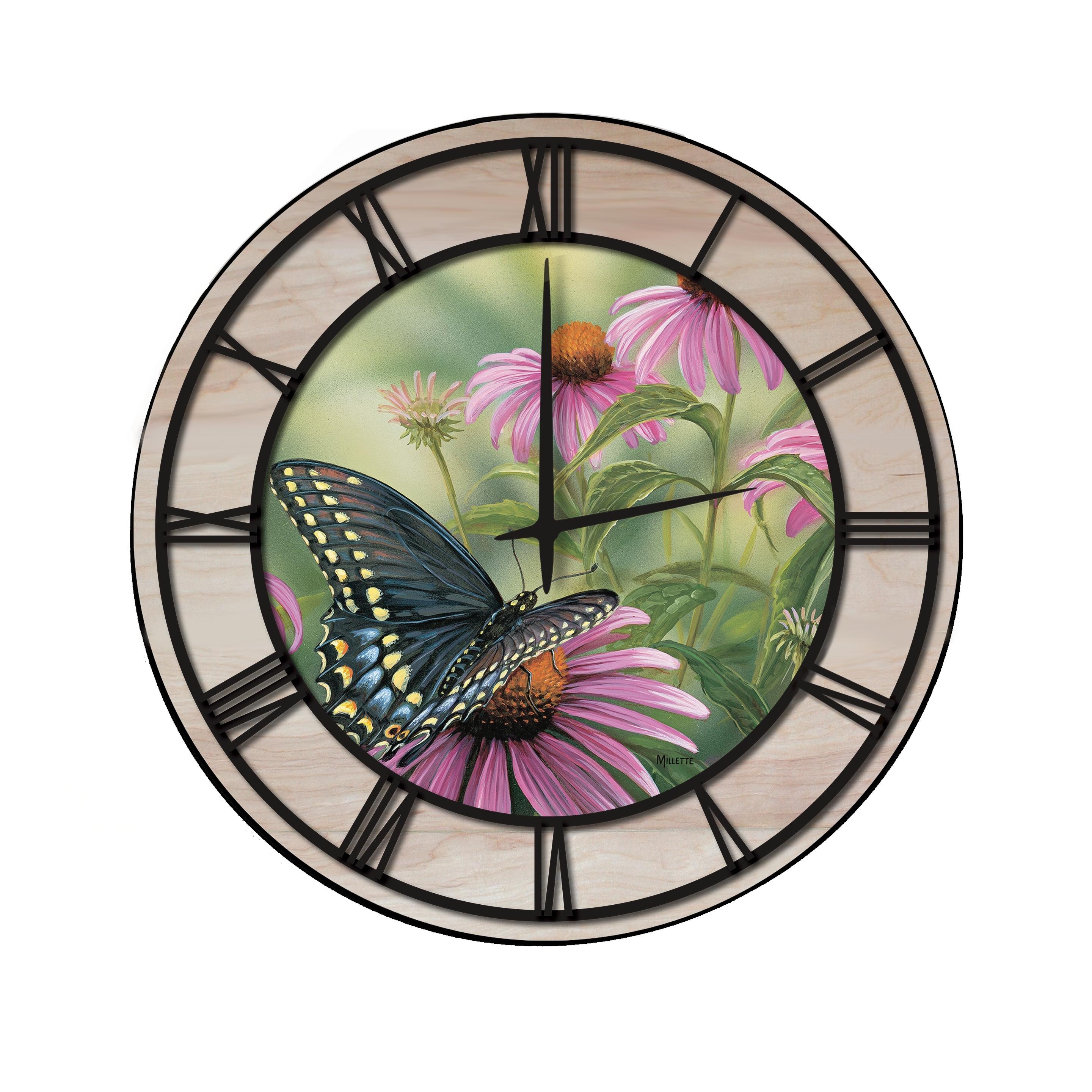 Wall Clock with Natural Woodgrain Accent - Black Swallowtail Butterfly - Black Numbers - 24" x 24"
