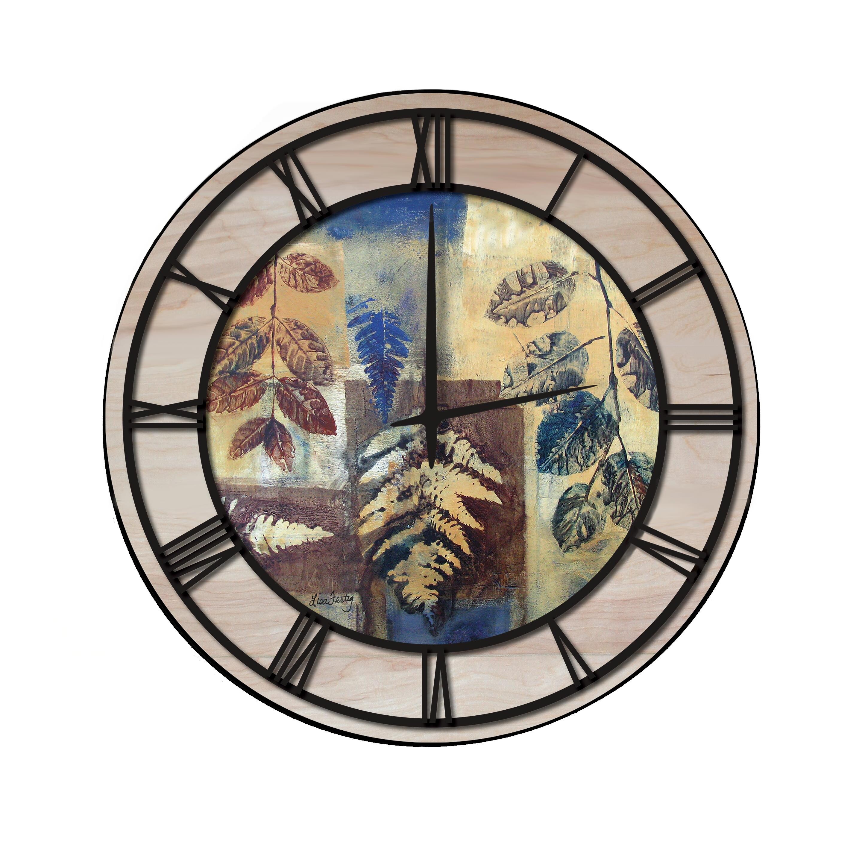 Wall Clock with Natural Woodgrain Accent - Leaves in Blue - Black Numbers - 24" x 24"