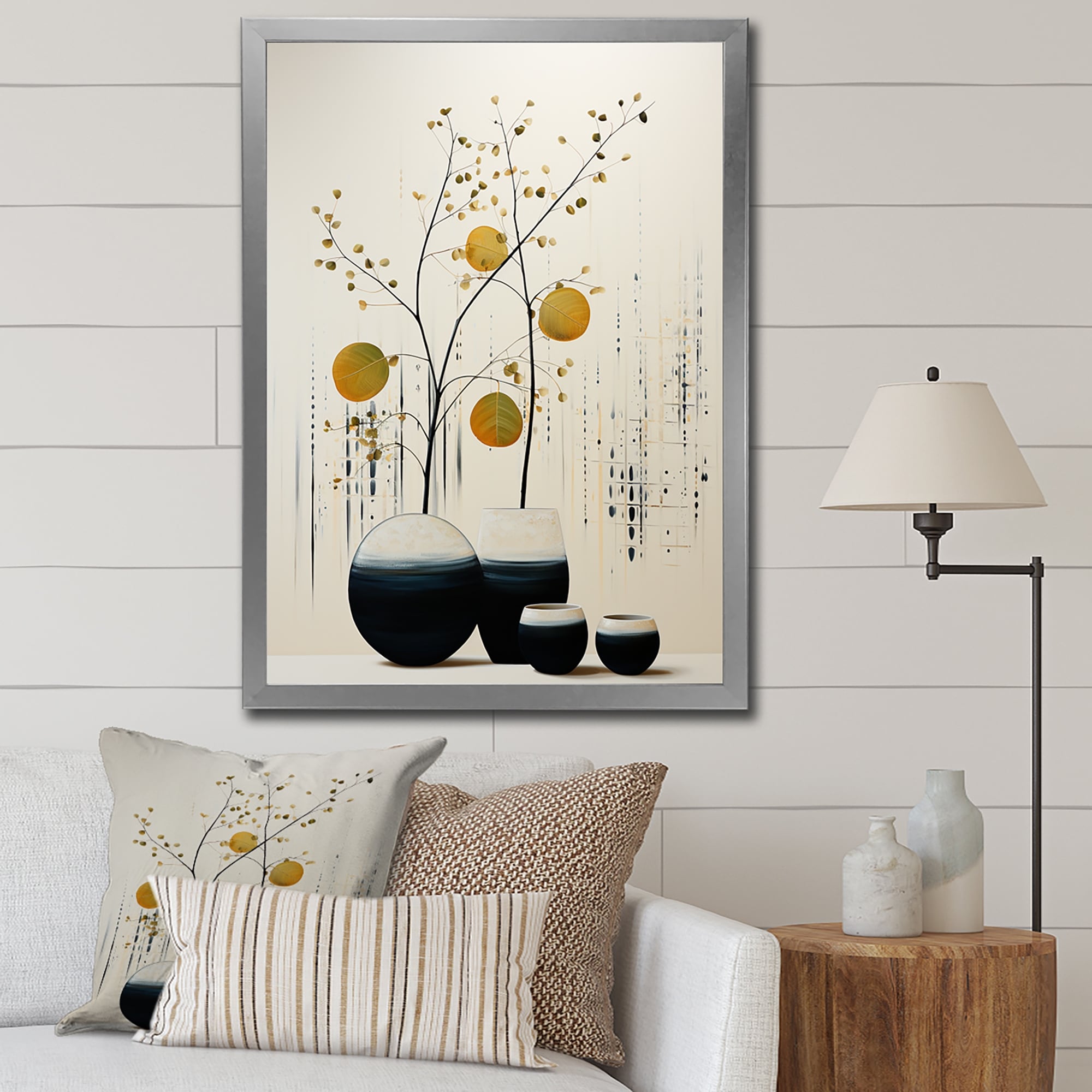 Designart "Beige Yellow Minimalist Oasis Poteries" Abstract Still Lifes Framed Wall Decor