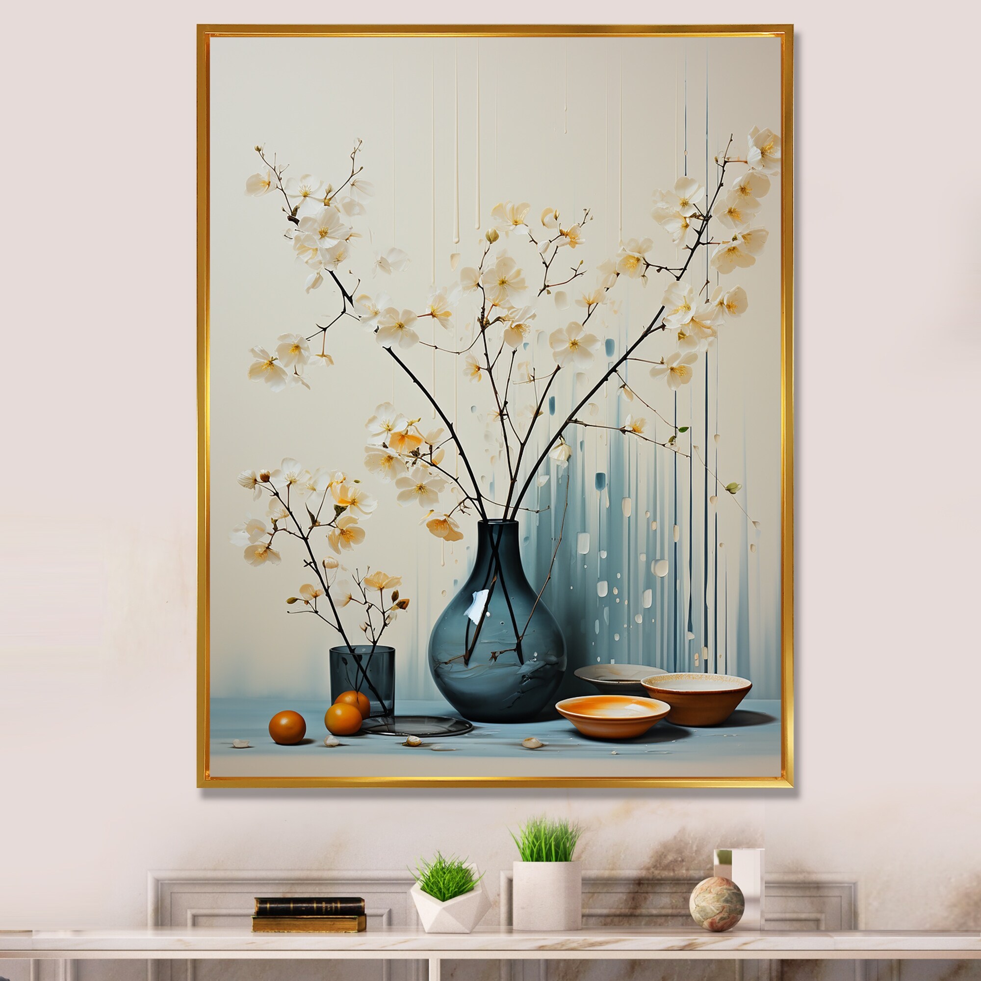 Designart "Beige Orange Mid Century Minimalist Oasis Poteries" Abstract Still Lifes Framed Canvas Art Print