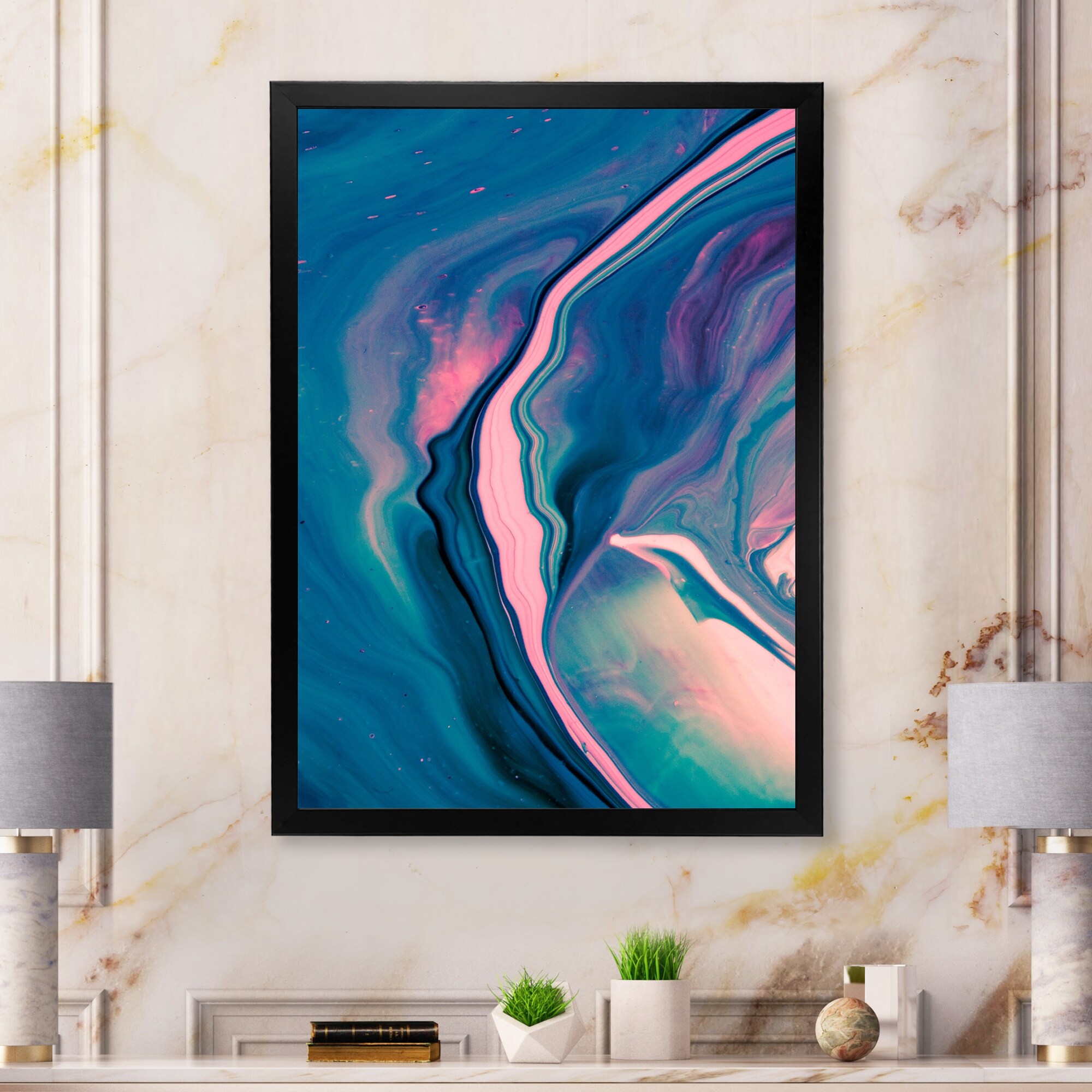 Designart "Luxury Blue And Pink Merble River" Abstract Framed Wall Decor