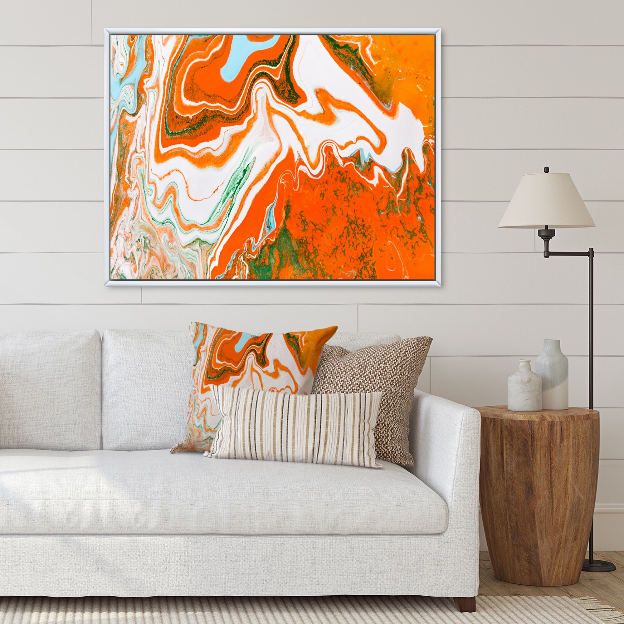 Designart "Liquid Marbling Orange Waves on White" Modern Framed Canvas Wall Art Print