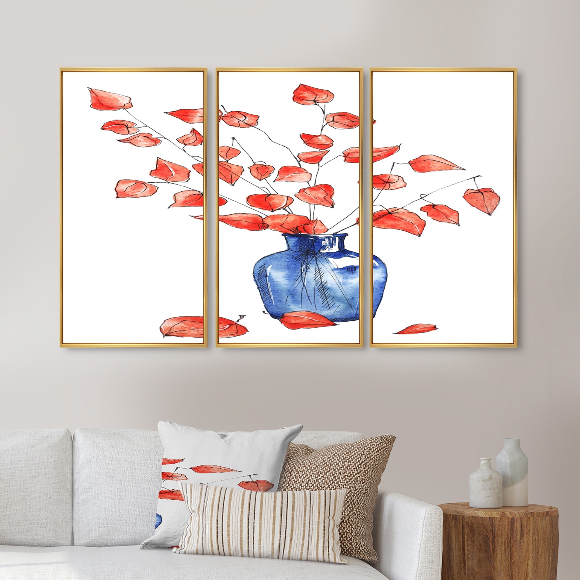 Designart "Autumn Still Life With Blue Vase, Orange Flowers" Traditional Framed Canvas Wall Art Print - 3 Panels