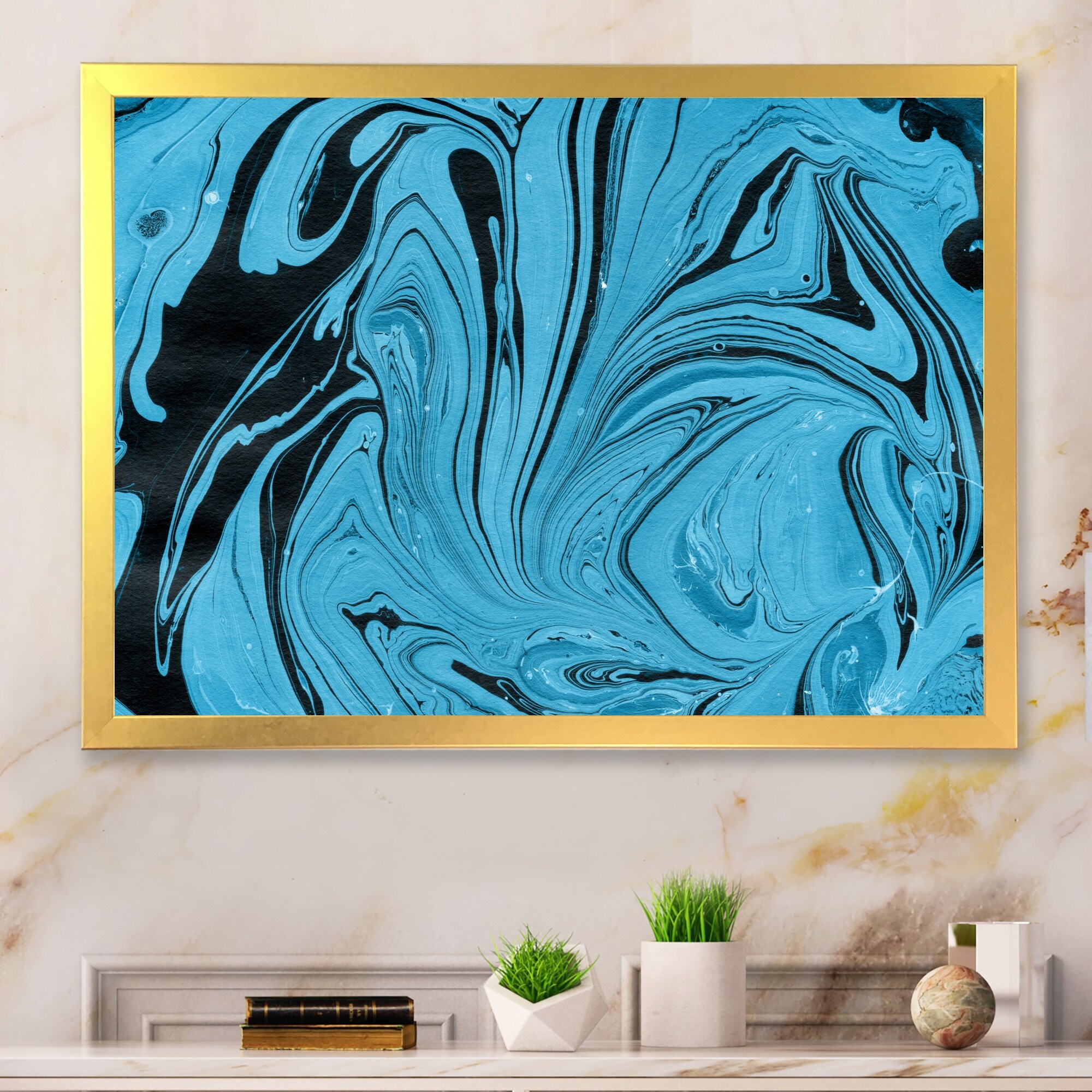 Designart "Blue Marble Paint Splashes II" Modern Framed Wall Decor