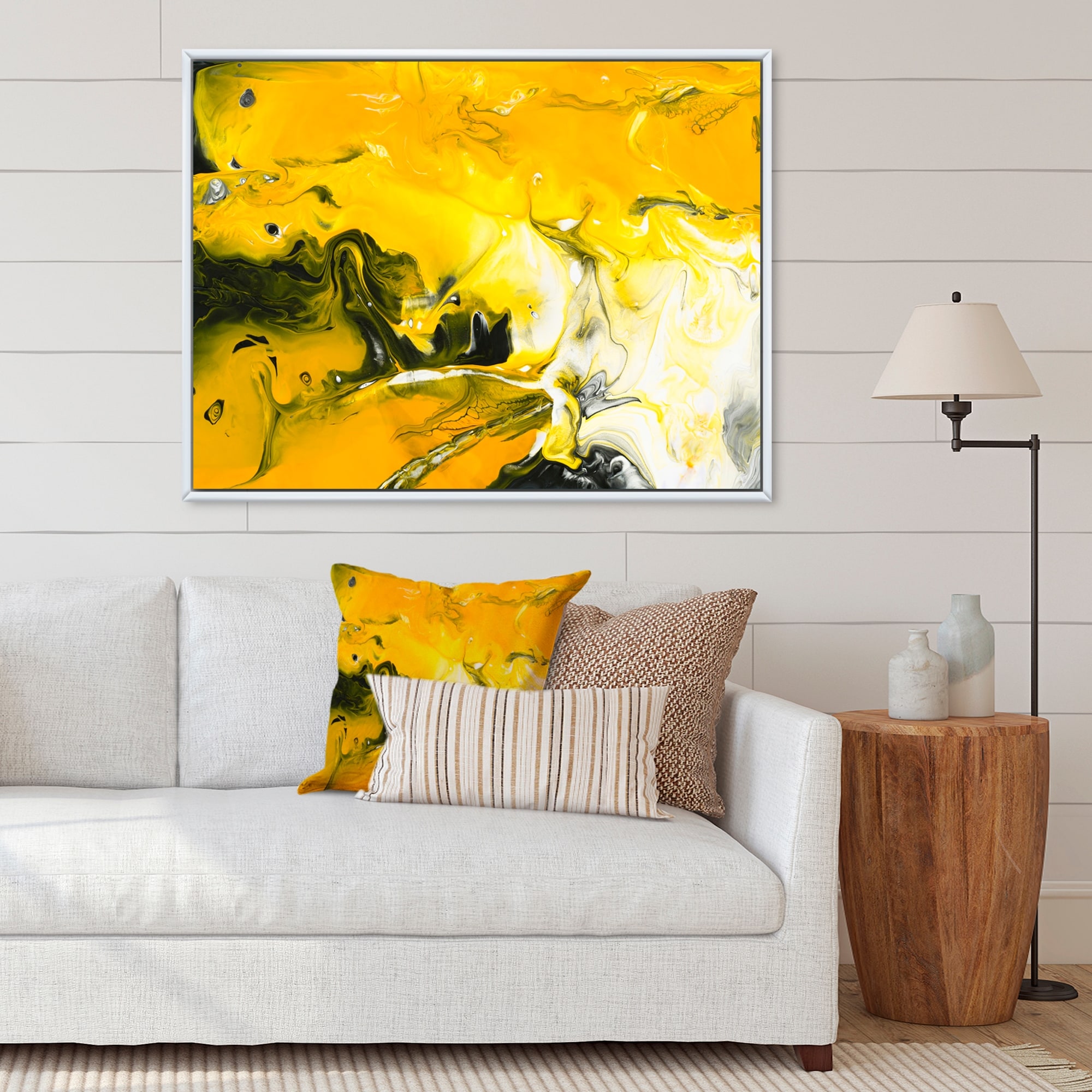 Designart "Yellow Black And White Liquid Art V" Modern Framed Canvas Wall Art Print