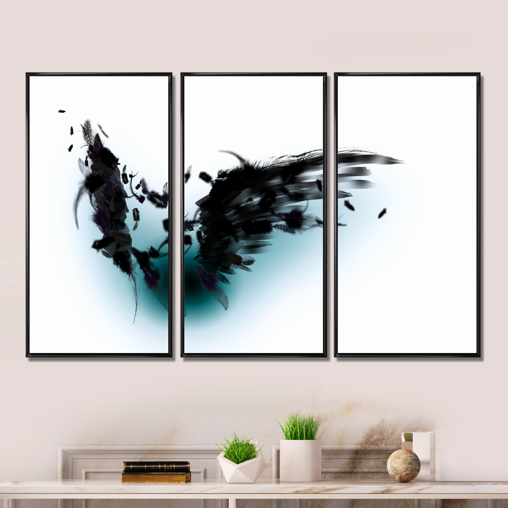 Designart "Black Wings" Abstract Framed Wall Decor Set of 3 - 4 Colors of Frames