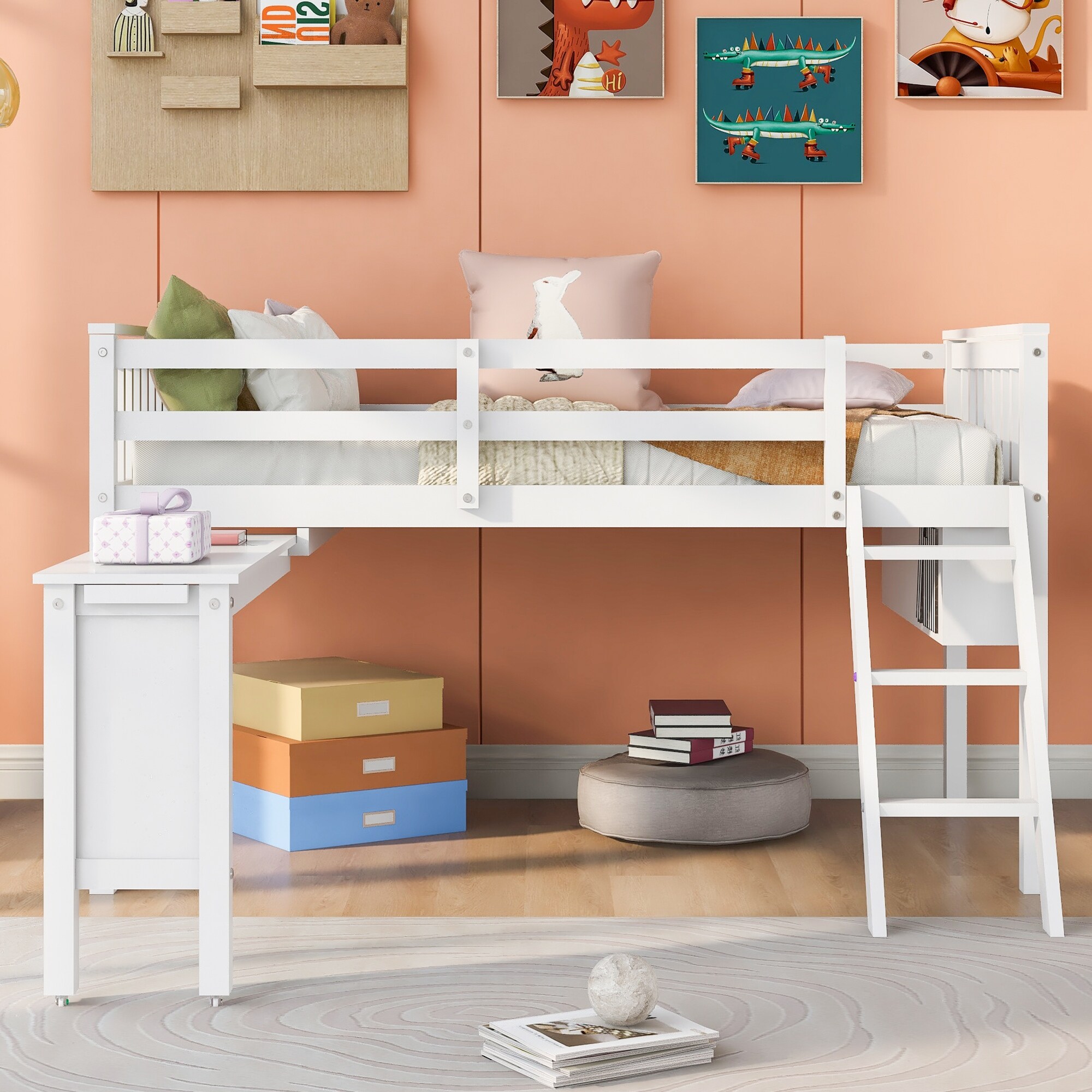 Twin Wooden Loft Bed with Removable Desk & Cabinet, White