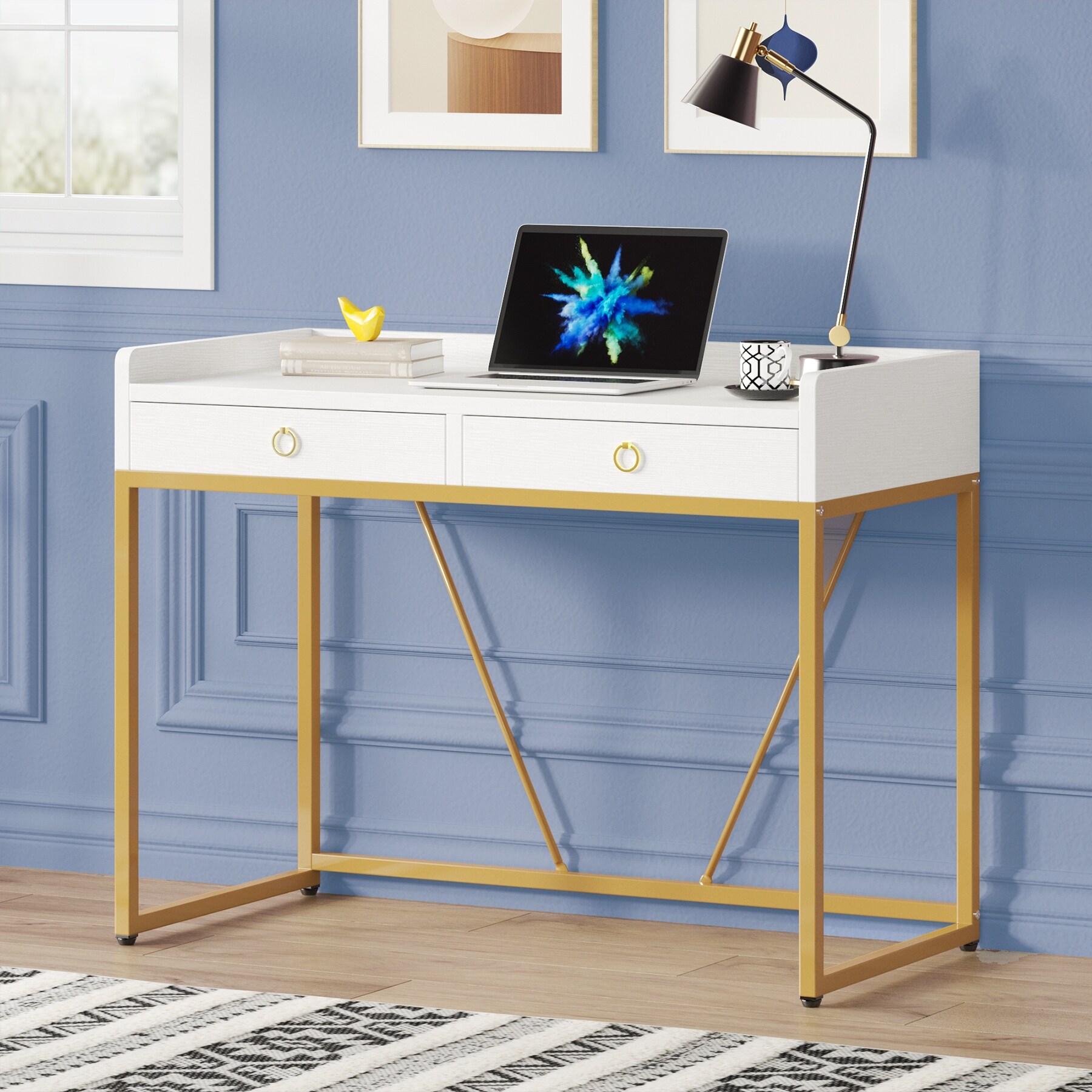 Modern Computer Desk Whiteand Gold Vanity Desk with Drawers for Home Office