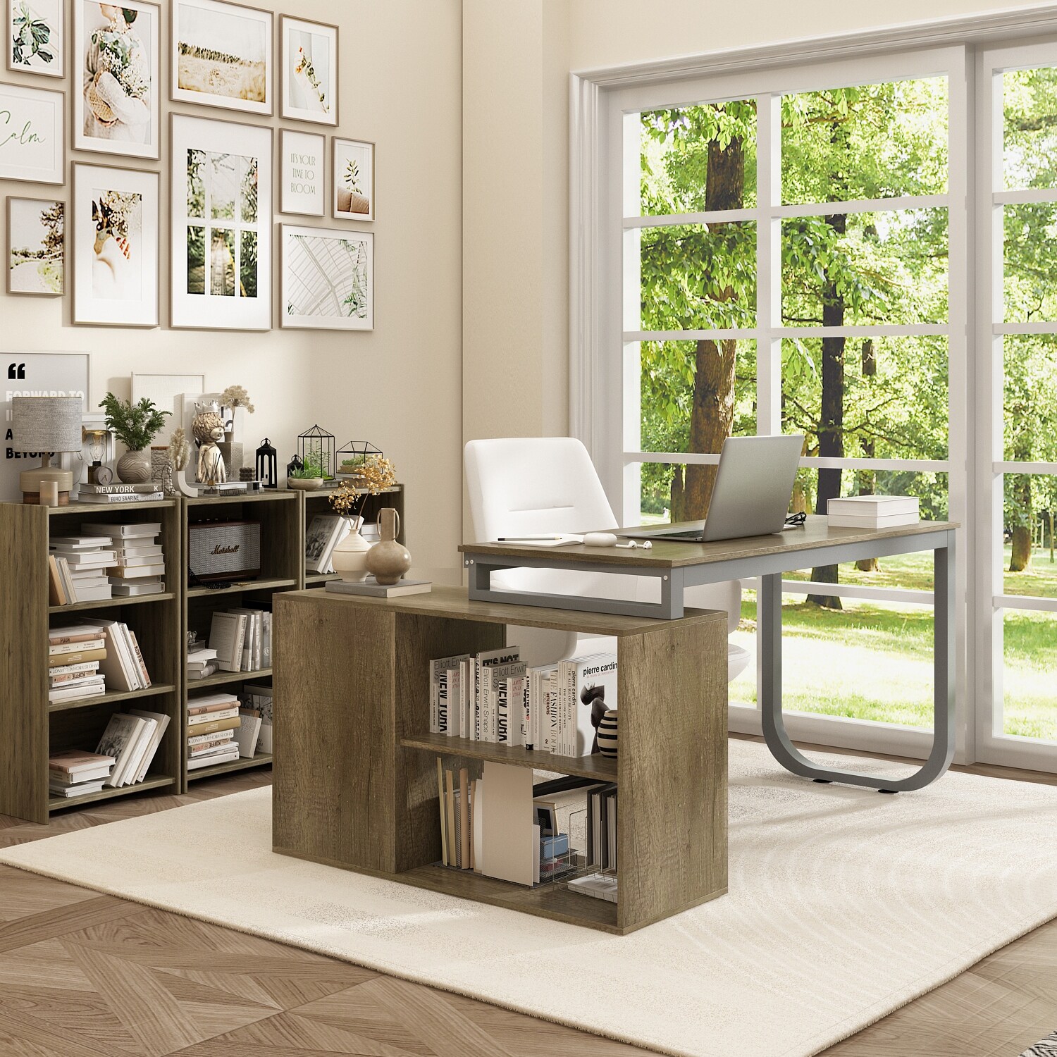 Grey L-Shaped Desk with Side Shelves