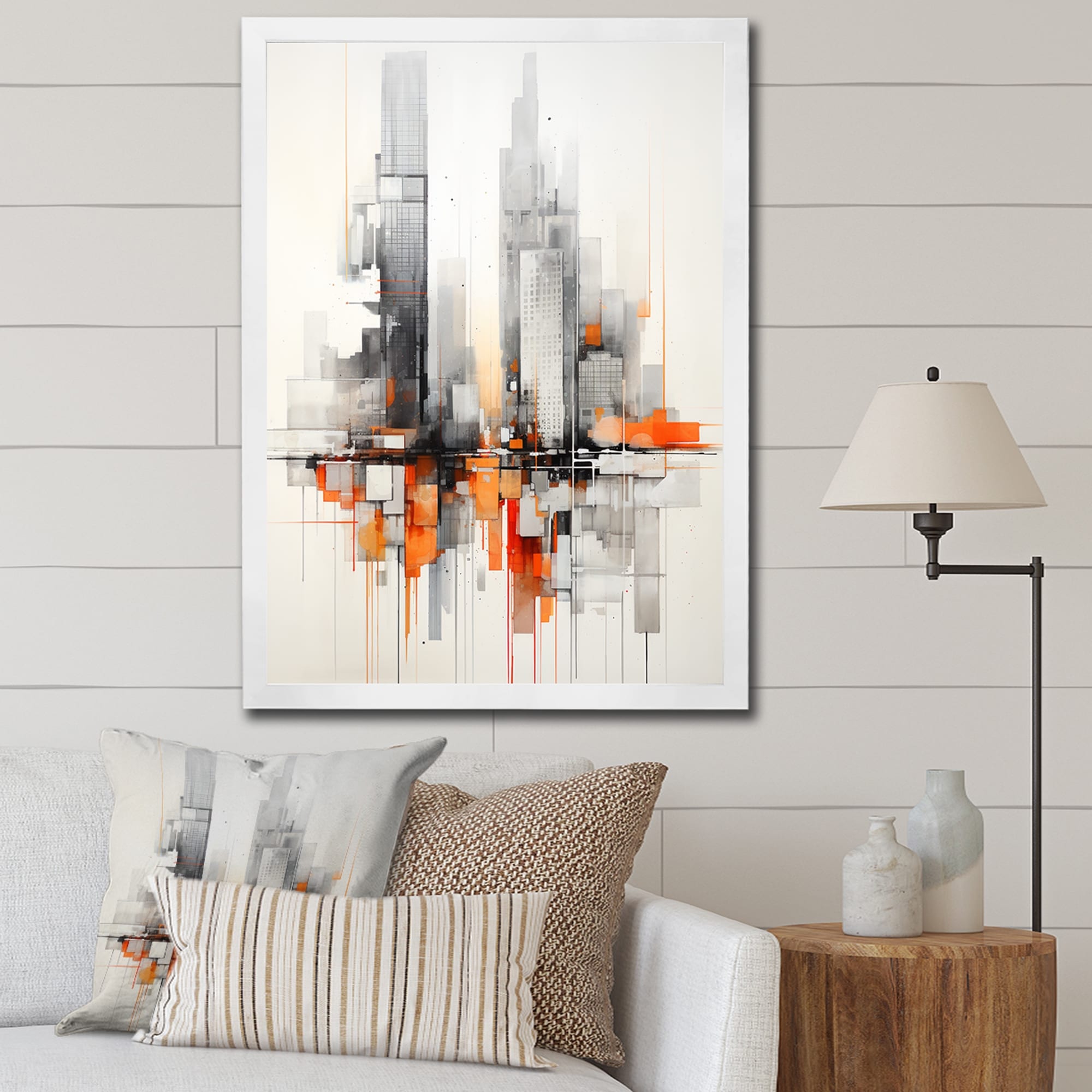 Designart "Orange Grey Minimalism Urban Rhythm I" Abstract Collages Framed Canvas Print