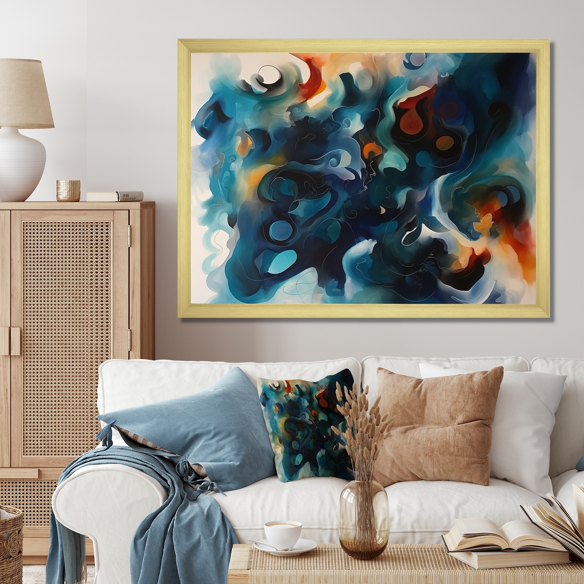 Designart "Blue And Orange Marble Liquid Ink Iii" Abstract Marble Framed Wall Art for Living Room