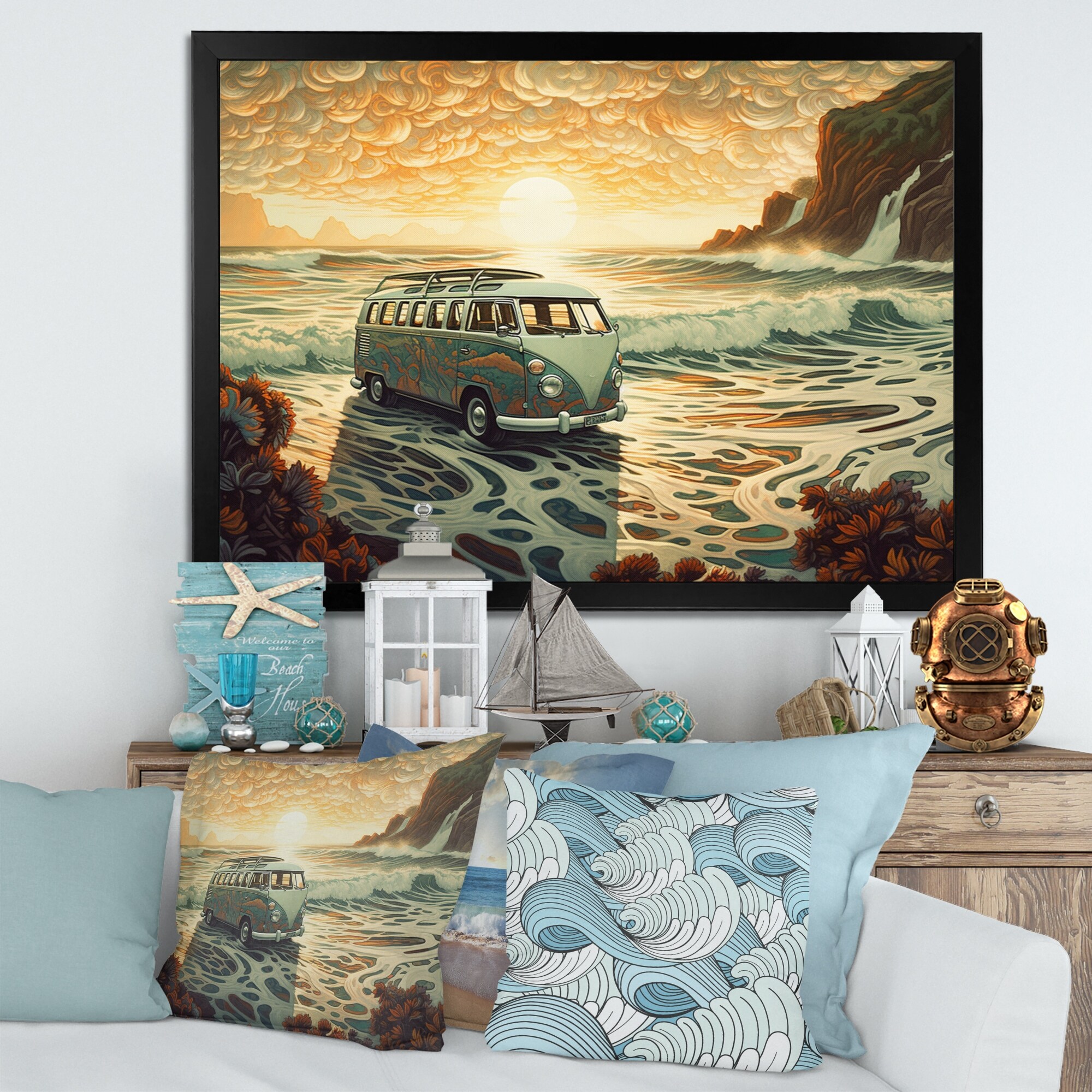 Designart "Green And Orange Retro Van on the Coastline I" Retro Car Framed Canvas Wall Art