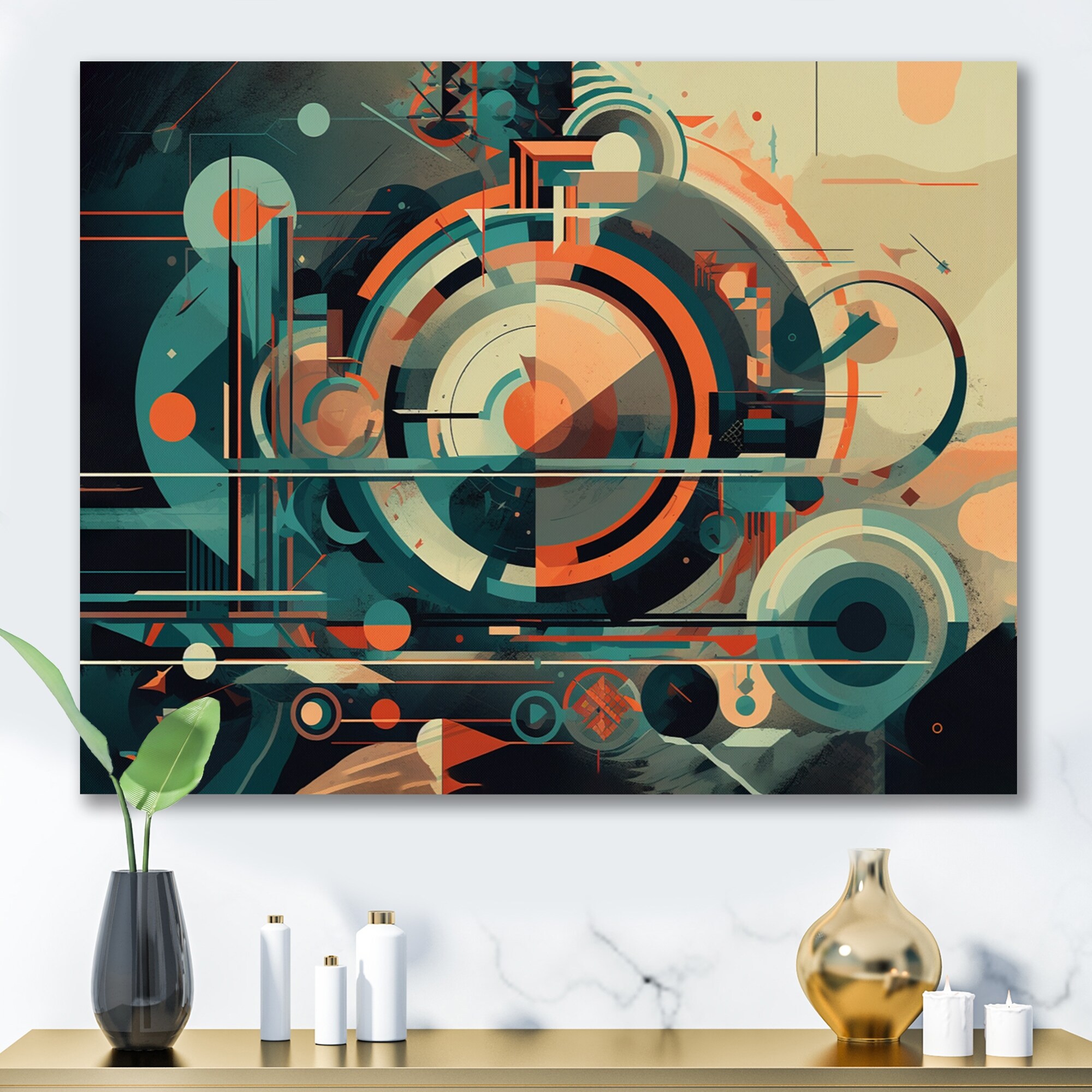 Designart "Orange And Green Nostalgic Visions" City Art Deco Canvas Art Print